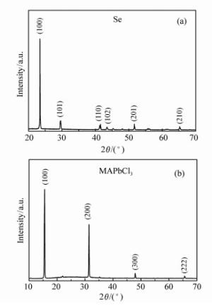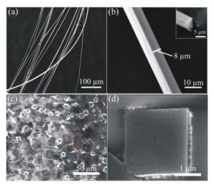 图 1 Se微米线的扫描电镜照片(a)低放大倍率; (b)单根Se微米线的放大图片。插图为微米线的断面图。(c)(d)分散在石英衬底上为不同倍率的MAPbCl3扫描电镜照片