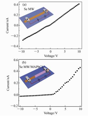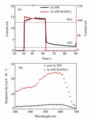Abstract: Efficient and stable p-type doping is difficult to achieve. To solve this problem, high-quality p-type Se microwires were fabricated using chemical vapor deposition. A photodetector based on a single Se microtube shows broadband photoresponses with a peak responsivity of 2.8 mA/W at 600 nm under 5 V bias. The cutoff wavelength is estimated to be 675 nm. A p-n heterojunction photodetector using a p-type Se microwire and n-type CH3NH3PbCl3 was also fabricated. Compared to the single Se microtube, the p-n heterojunction photodetector shows obvious reduction in response time and 850% improvement in responsivity. The experimental results indicate that p-n junctions have promising applications in high-performance photodetectors.-