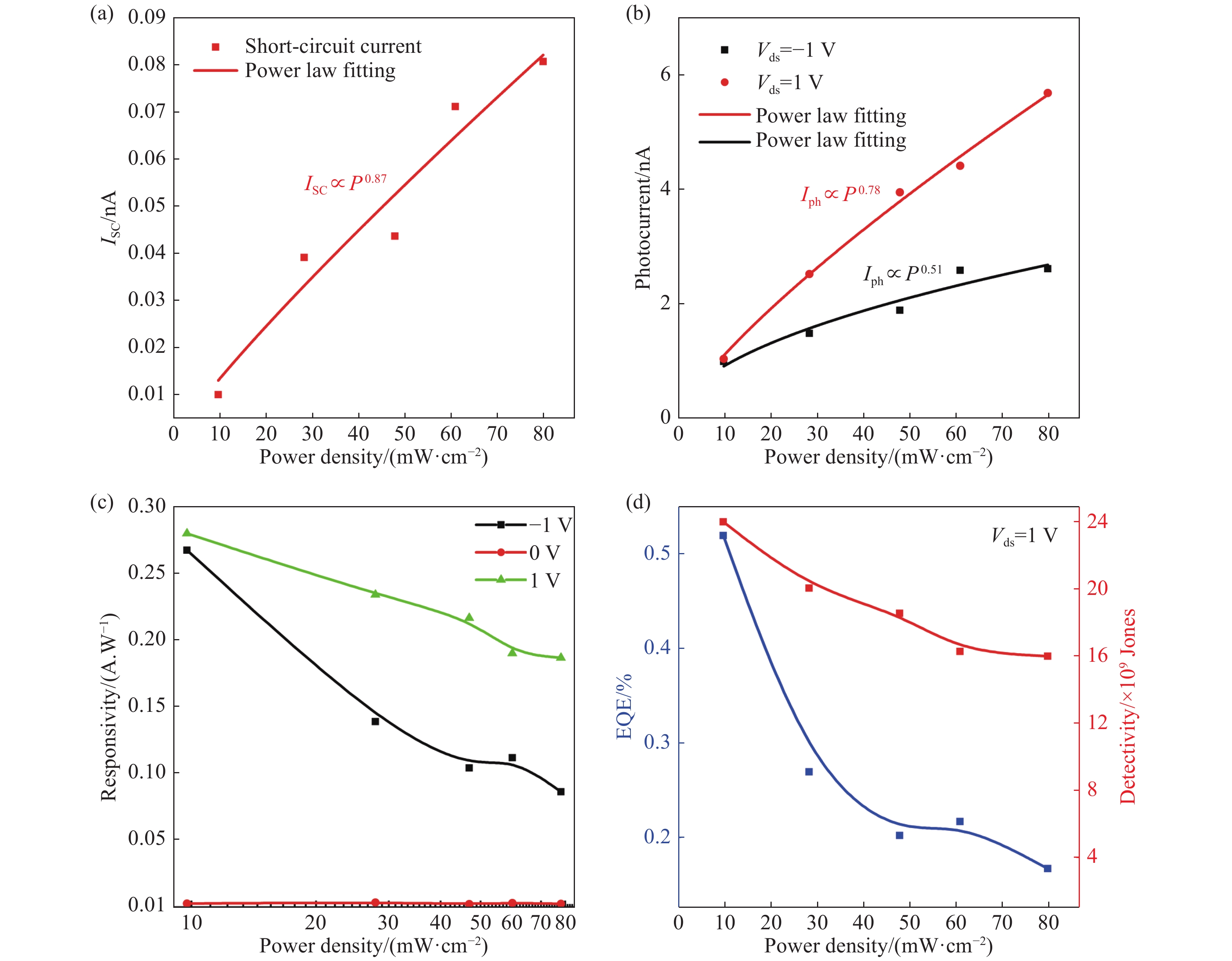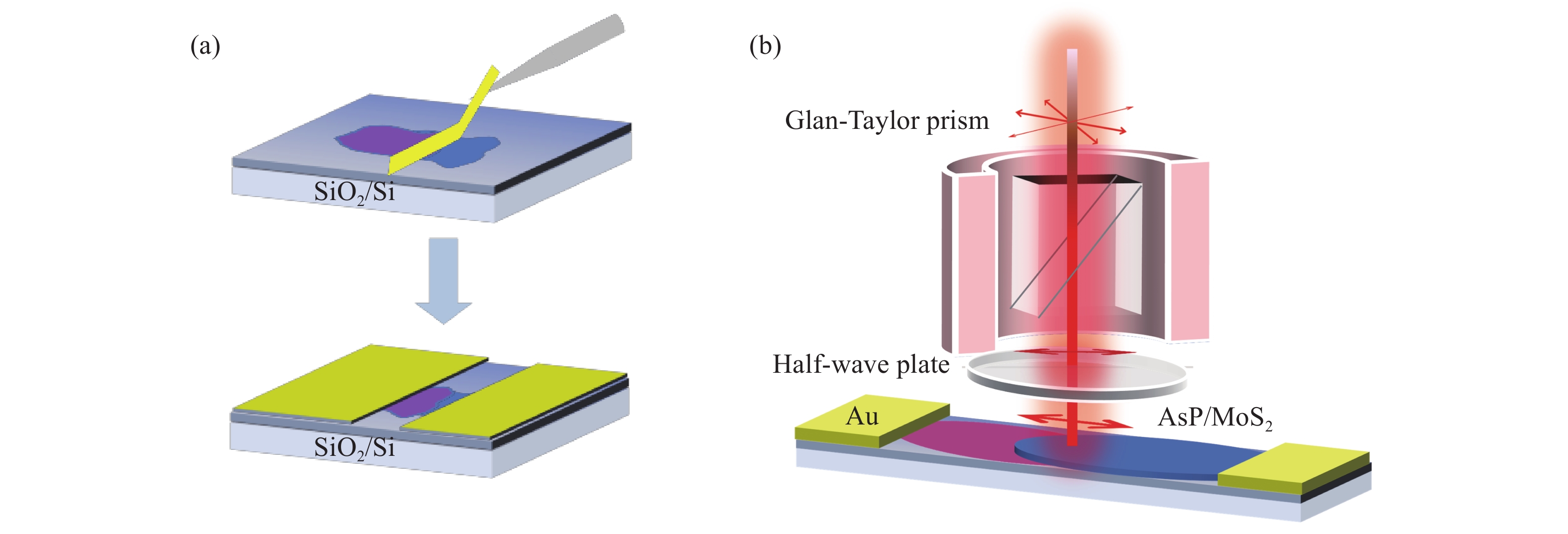 线偏振光的探测能力是评价偏振光电探测器件的重要指标。黑砷磷(AsP)是一种较为稳定的平面内各向异性材料,由于其面内结构各向异性,其对线偏振光较为敏感,在偏振探测领域有着重要的应用潜力。本文介绍了一种基于AsP/MoS2的高度偏振敏感光电探测器。由于AsP各向异性的光吸收、MoS2有效的载流子收集和输运能力以及范德华异质结对暗电流的抑制作用,该光电探测器实现了大于300的电流开关比,0.27 A/W的电流光响应度以及2×1010 Jones的比探测率。更重要的是,此类光电探测器在638 nm波段实现了高达3.06二向色性比的偏振特性。这些实验结果表明AsP/MoS2异质结构在偏振光电探测领域有着广阔的应用前景。