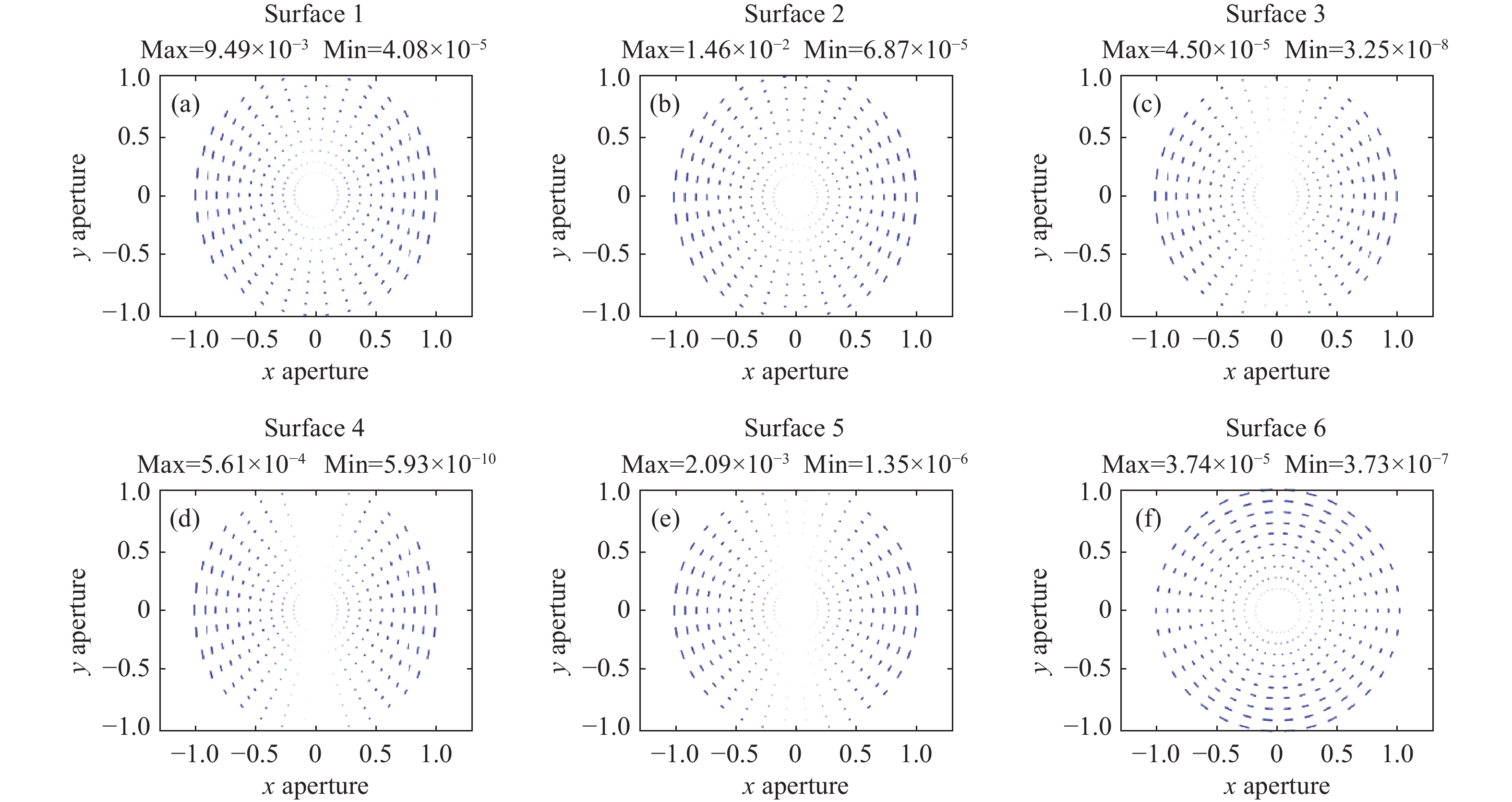 变形光学系统是一种具有双平面对称性的相对特殊的光学系统,其结构会引入非旋转对称的偏振像差。针对这一问题,本文构建一个折反式变形光学系统,并对该系统的偏振像差及其对点扩散函数的影响进行系统分析。基于三维偏振光线追迹对折反式变形光学系统进行仿真计算,获得偏振像差的详细数据,并计算各个表面的二向衰减、相位延迟分布特性以及系统的琼斯瞳、振幅响应矩阵、点扩散函数和偏振串扰对比度。结果表明:最大二向衰减为0.145,最大相位延迟为1.46×10−2 rad,均出现在次镜位置。2∶1变形比的光学系统的振幅响应函数在长焦端和短焦端方向的偏振串扰项存在40.6%的差异,偏振串扰将该变形光学系统的对比度限制在10−6量级。高精度变形光学系统中的偏振像差不可忽略,可采用膜层设计和折反式结构等方法降低偏振像差影响。该研究结论可为变形光学系统在深空探测、相干通信系统等领域的设计提供参考。