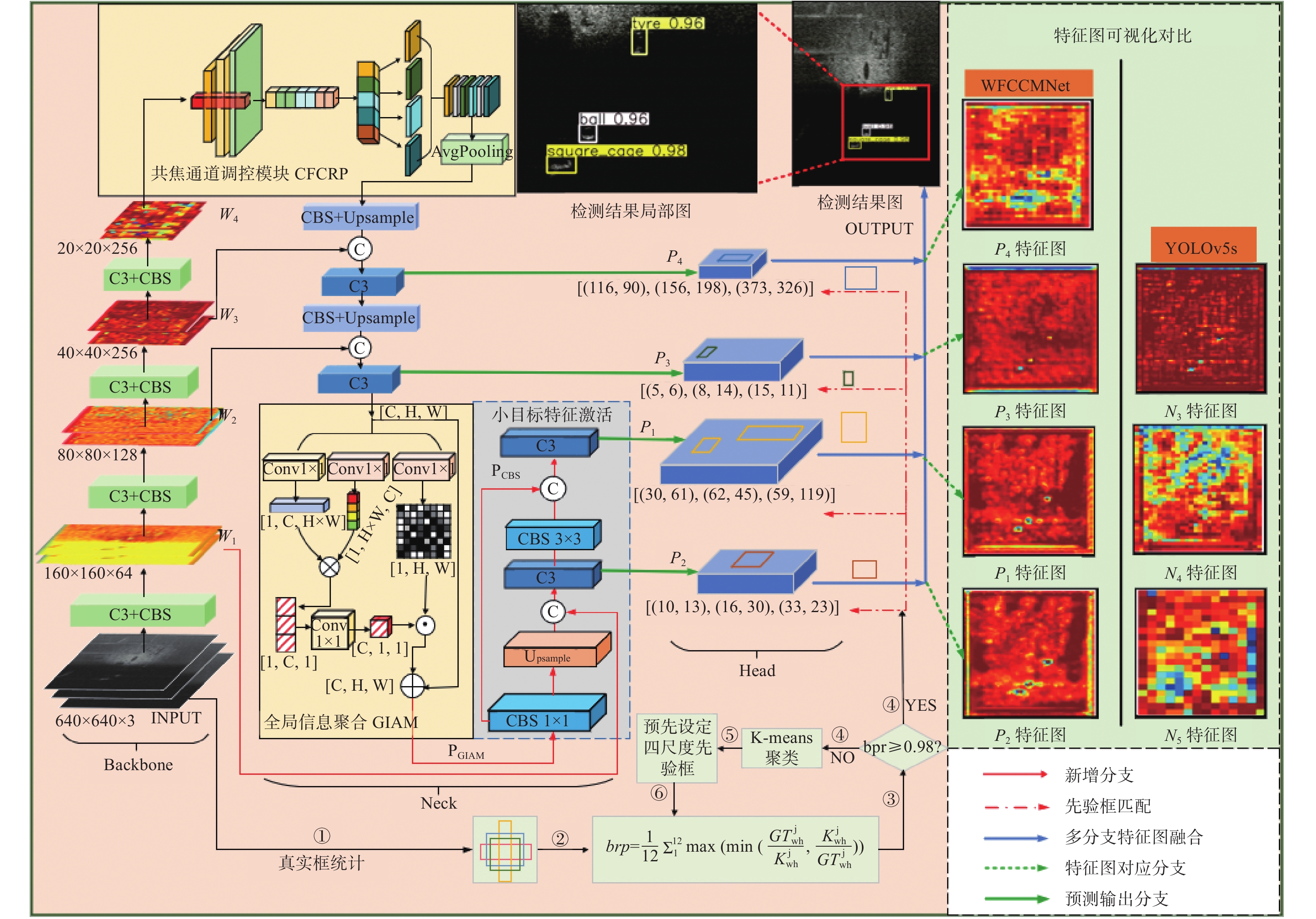 声呐图像视觉检测是复杂水域资源勘探和水下异物目标探测领域的重要技术之一。针对声呐图像中小目标存在的特征微弱和背景信息干扰问题,本文提出弱特征共焦通道调控水下声呐目标检测算法。为了提高模型对弱小目标的信息捕获和表征能力,设计弱小目标特征激活策略,并引入先验框尺度校准机制匹配底层语义特征检测分支,以提高小目标检测精度。应用全局信息聚合模块深入挖掘弱小目标的全局特征,避免冗余信息覆盖小目标微弱关键特征。为解决传统空间金字塔池化易忽视通道信息的问题,提出共焦通道调控池化模块,保留有效通道域小目标信息并克服复杂背景信息干扰。实验结果表明,本文所提模型在水下声呐数据集的9类弱小目标识别的平均检测精度达83.3%,相较基准提高了5.5%,其中铁桶、人体模型和立方体检测精度得到显著提高,分别提高24%、8.6%和7.3%,有效改善水下复杂环境中弱小目标漏检和误检问题。