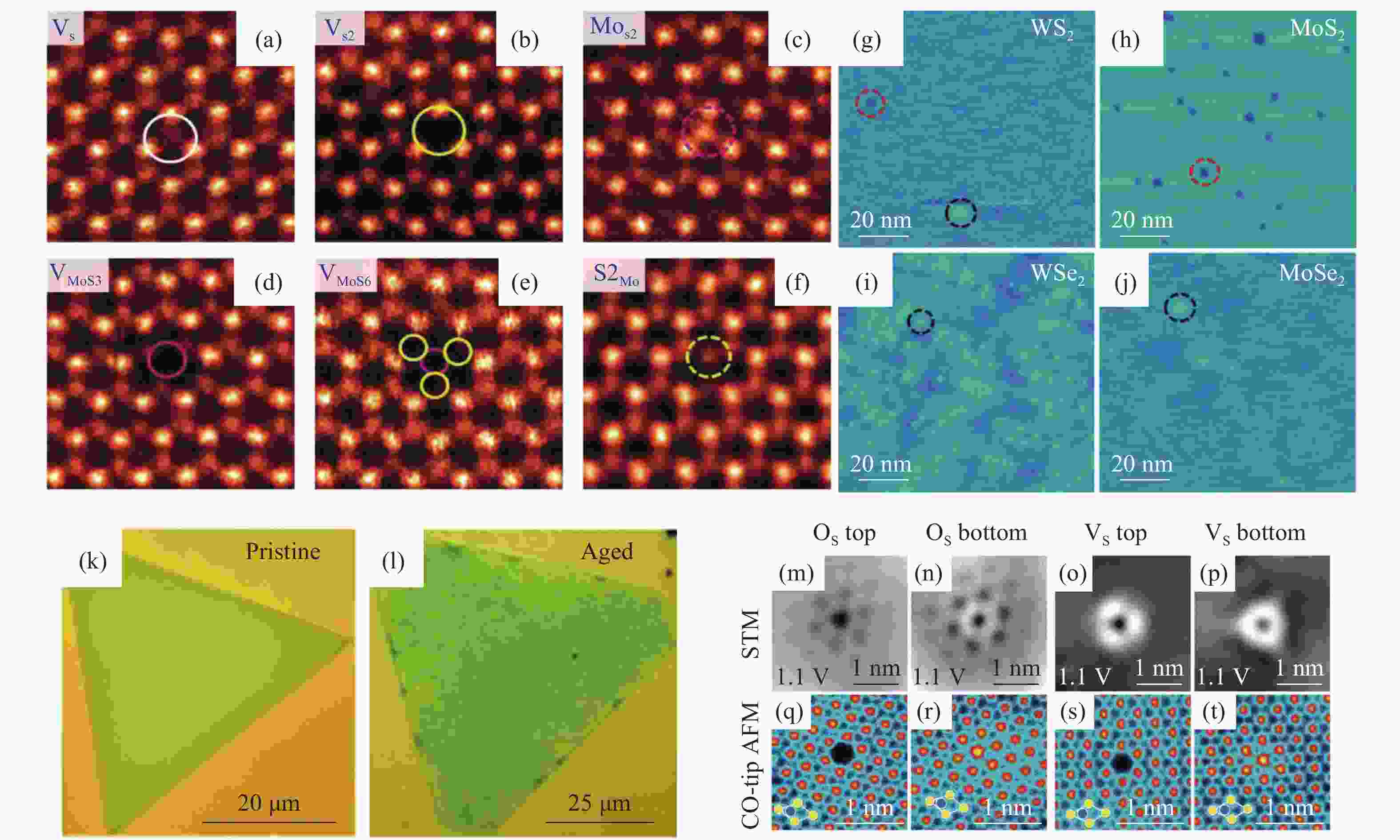 图 1 二维TMDCs中点缺陷的高分辨表征。 (a−f) STEM-ADF对MoS2中6种点缺陷的表征[85];(g−j)4种常见的TMDCs材料中缺陷的STM表征,深蓝色的点代表原子缺失或存在受体杂质,亮黄色的点代表存在给体杂质[86];(k)新制备的MoS2与(l)在大气中放置8个月后的光学显微镜照片的对比[90];(m−t)超高分辨STM和非接触式AFM对WS2中点缺陷的表征[88]