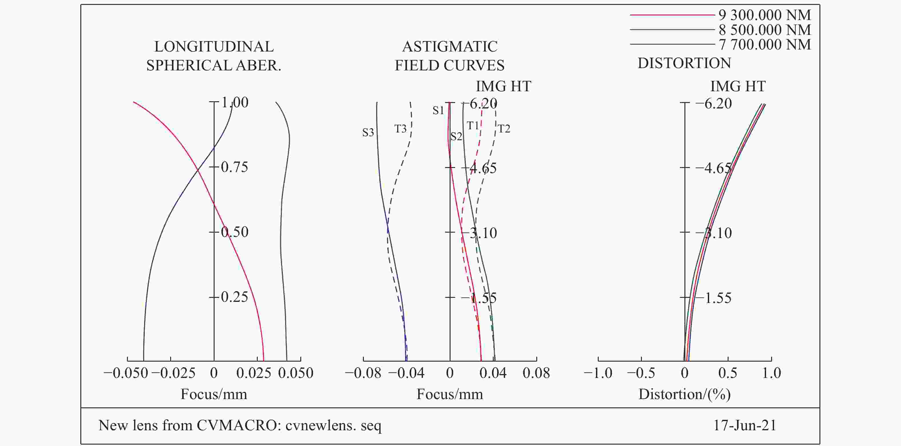 图 5  长波光学系统球差、场曲和畸变曲线图