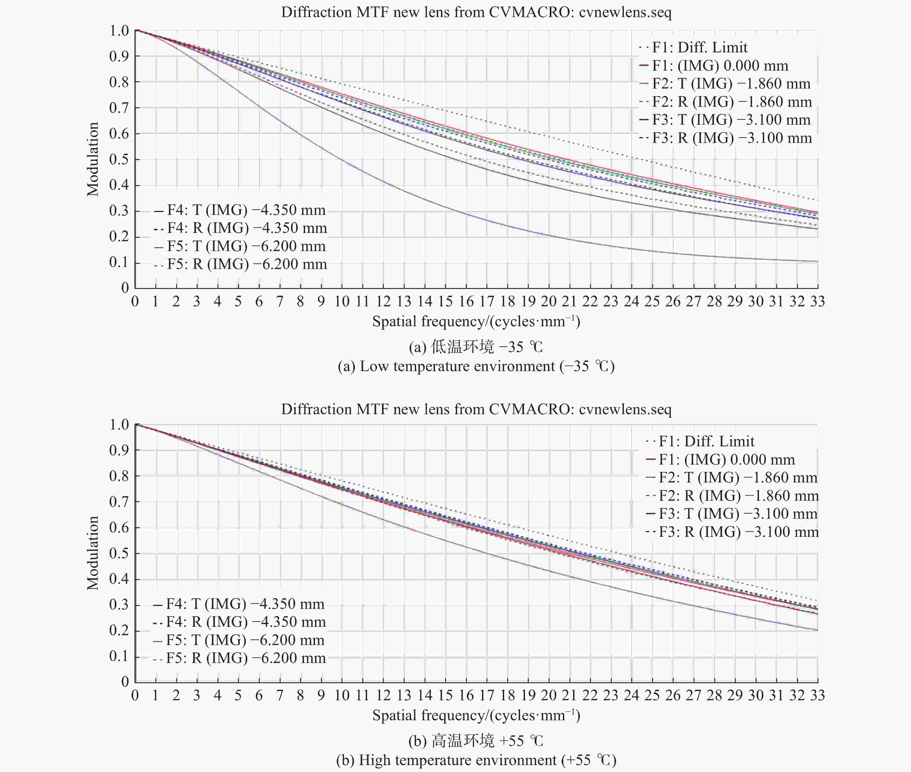 Figure 6.  The MTF curve diagrams of the system after focusing in high- and low-temperature environments