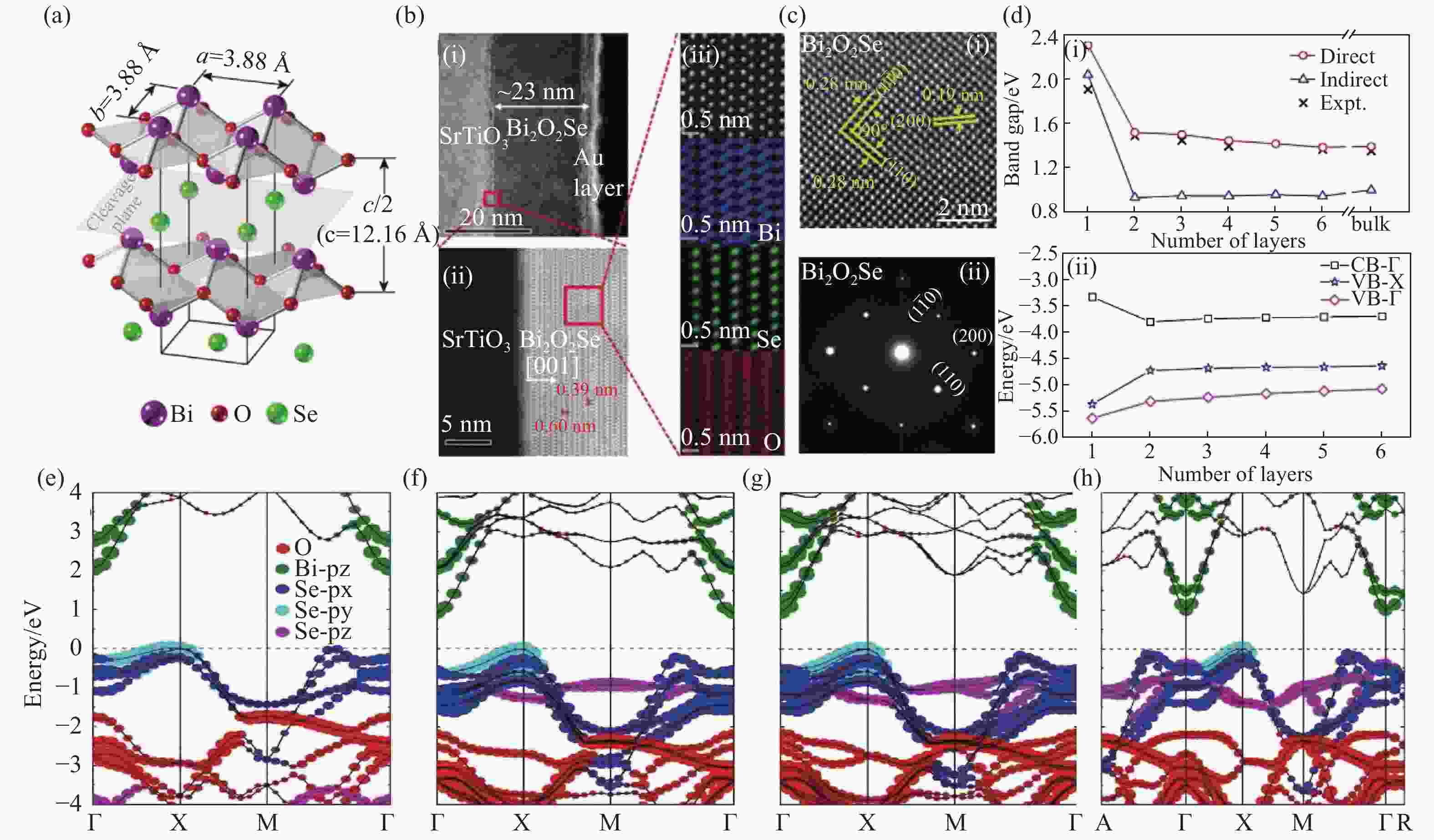 $\left[ {{\rm{Bi}}_2{{\rm{O}}_2}} \right]_n^{2n + }$ 层和$\left[ {{\rm{Se}}_2} \right]_n^{2n - }$ 层组成。(b) 在Ts = 425 °C下沉积的Bi2O2Se/STO纳米片的横截面低倍和高倍分辨透射电镜图。(c) Bi2O2Se的HRTEM图像和SAED图。(d) (i) 计算得到的带隙与超薄Bi2O2Se纳米片层数的函数关系。直接带隙(圆形)、间接带隙(三角形)和实验光学带隙(十字)。(ii) VB-Γ(菱形)和VB-X(五角星)处最高价带以及CB-Γ(正方形)处最低导带的能级。(e) 单层、(f) 双层、(g) 三层、(h) 块体Bi2O2Se的能带结构。VBM设置为0 eV,由水平虚线标记。[25, 38-39, 77]Figure 4. (a) Body-center tetragonal crystal structure of Bi2O2Se, consisting of alternating Bi2O2 and Se layers. (b) Cross-section examination of the Bi2O2Se/STO film deposited at Ts = 425 °C by low-magnification TEM and HAADF-STEM characterizations. Copyright © 2020, IOP Publishing. (c) HRTEM image and SAED image of Bi2O2Se. Copyright © 2021, John Wiley and Sons. (d) (i) Calculated band gaps as a function of the number of layers for ultrathin Bi2O2Se films. Direct band gap (Γ-Γ) (circles) and indirect band gap (X-Γ) (triangles) and experimental optical band gap (Expt.) (Crosses). (ii) Energy of band edge with respect to the vacuum level for the highest valence band at VB-Γ (Diamonds) and at VB-X (Stars), and lowest conduction band at CB-Γ (Squares). Orbital-projected band structures for (e) monolayer, (f) bilayer, (g) tri-layer, (h) bulk Bi2O2Se. Band weights of Bi 6p, Se 4p and O 2p orbitals are sized by symbols. Valence band maximum (VBM) is set as 0 eV, as marked by the horizontal dashed lines. Copyright © 2021, Elsevier.[25, 38-39, 77]
