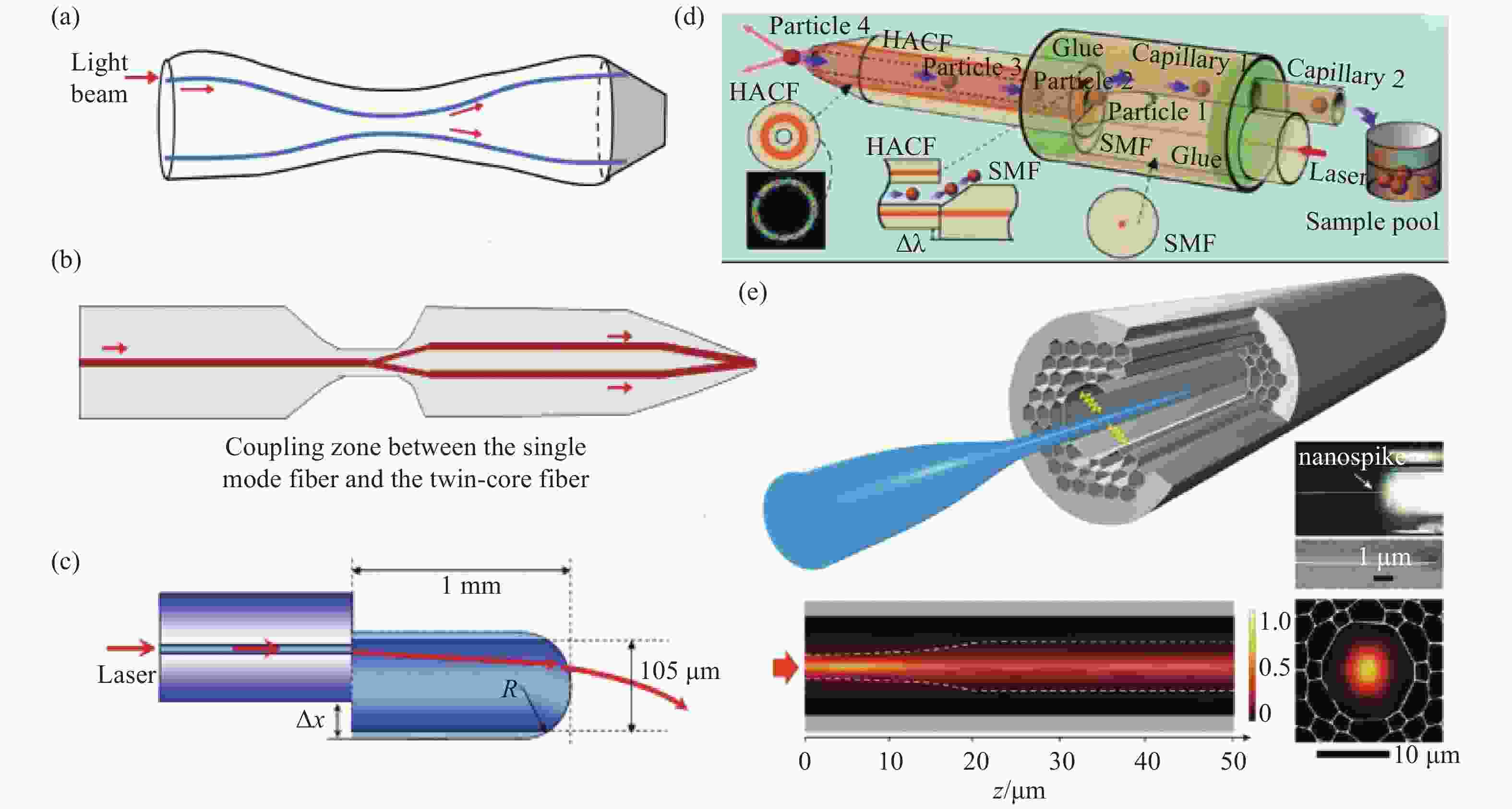 图 3 特种芯光纤探针耦合结构示意图。(a)单模光纤直接熔接探针中一芯,耦合后双芯通光;(b)单模光纤直接熔接双芯探针,拉锥熔接区域耦合通光[22];(c)单模光纤错芯熔接多模探针,干涉产生不对称类贝塞尔光束[27];(d)单模错位熔接中空环形芯光纤探针[13];(e)单模光纤纳米探针耦合中空光子晶体光纤[28]