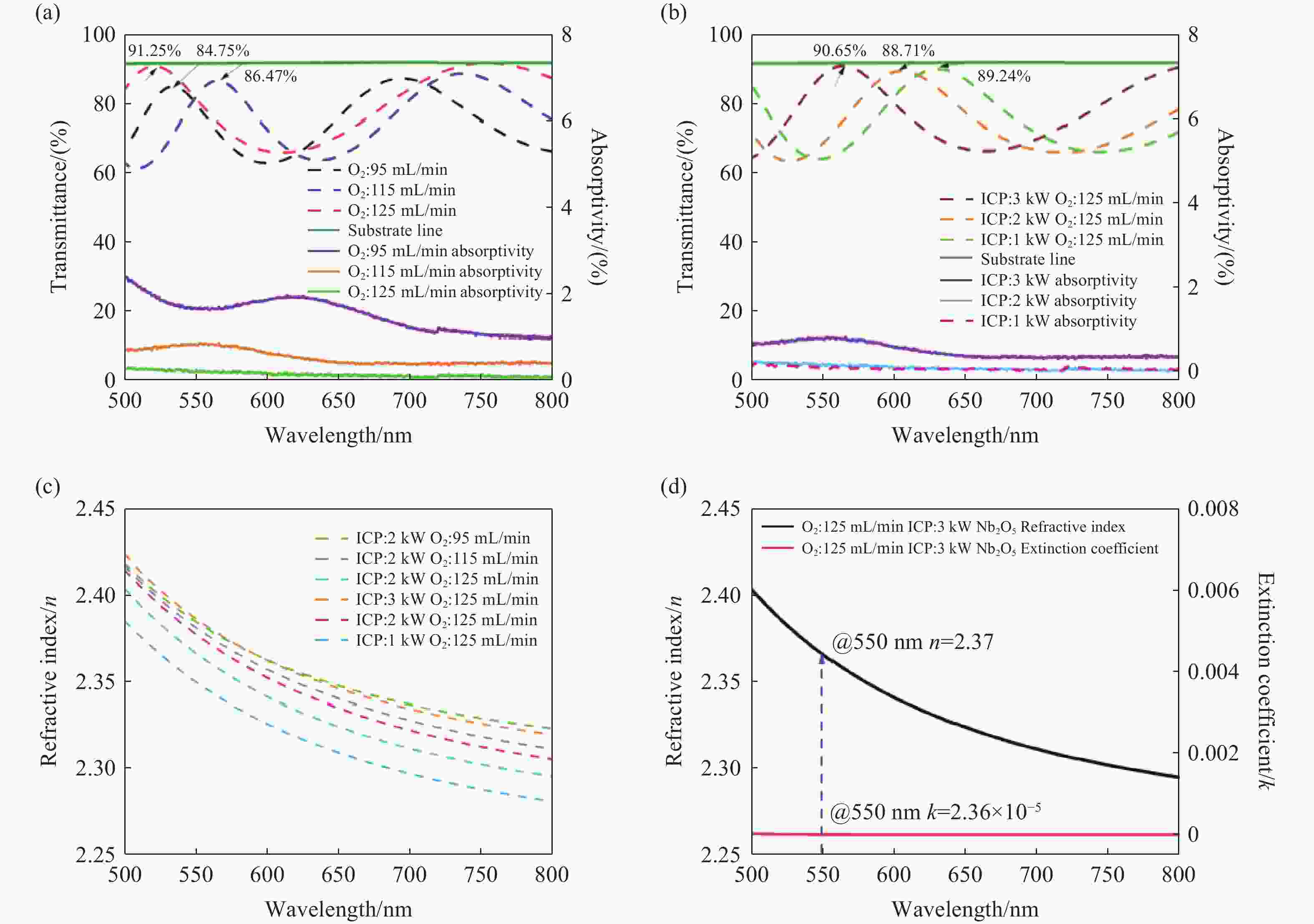图 1 Nb2O5薄膜的特性曲线。(a)不同充氧量膜层透过率曲线;(b)不同ICP功率膜层透过率曲线;(c)不同充氧量及ICP功率膜层折射率曲线;(d) 充氧量为125 mL/min,ICP功率为3 kW膜层光学常数曲线