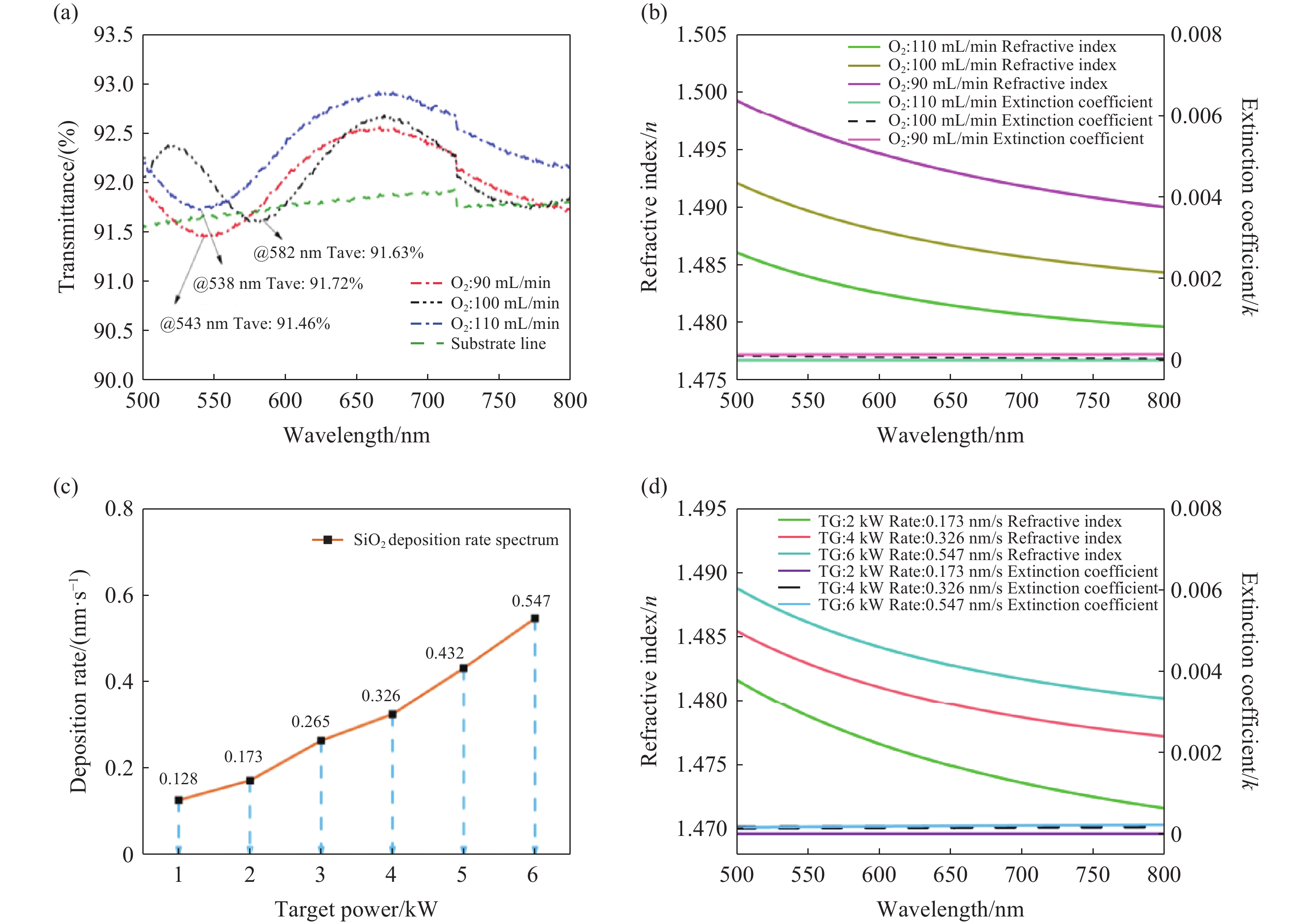 图 2 SiO2薄膜的特性曲线。(a)不同充氧量膜层透过率曲线;(b)不同充氧量膜层光学常数曲线;(c)不同靶材功率膜层沉积速率曲线;(d)不同沉积速率膜层光学常数曲线