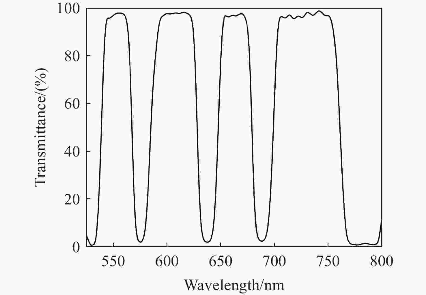 cut-off region$ {\lambda _{\text{1}}} $@576 nm T<5% 5 nm @545~562 nm T>90% @531~535 nm T<3% $ {\lambda _{\text{2}}} $@639 nm T<5% 6 nm @597~624 nm T>90% @775~785 nm T<3% $ {\lambda _{\text{3}}} $@690 nm T<5% 7 nm @655~675 nm T>90% @708~755 nm T>90% 表 2 高低折射率膜层厚度比所对应的反射带半宽度