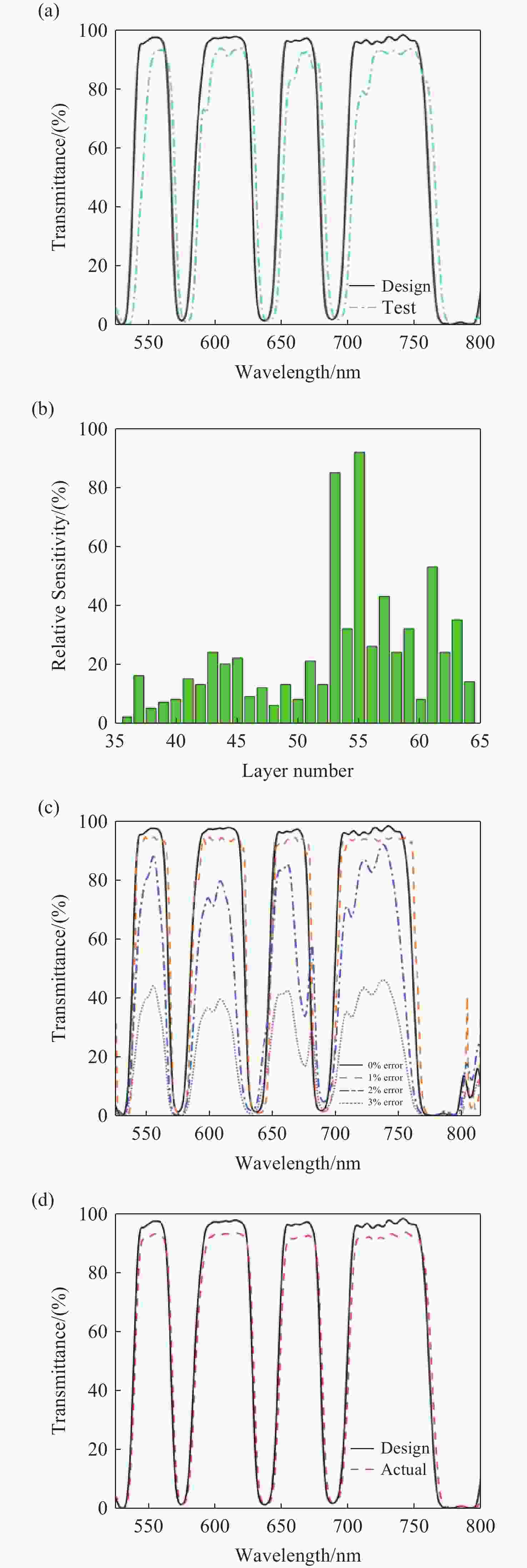 图 9 多通道负滤光膜的特性曲线。(a) 设计与测试光谱曲线;(b) 36~64层的敏感度分布曲线;(c) 随机误差(1%~3%)光谱曲线;(d) 负滤光膜实测光谱曲线