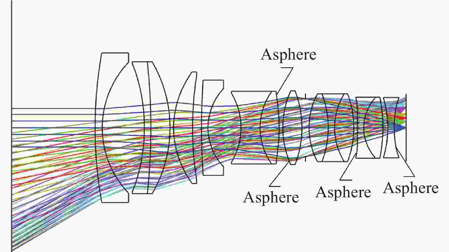 1000 nm)、大视场(61°)、小F数(1.38)、低畸变的光学系统。该光学系统具备六等星的探测能力,能够实现对空间目标的广域探测。首先,建立空间目标探测辐射特性模型与光学系统参数的映射关系,然后开展相应的光学系统设计理论分析,采用反摄远式结构作为初始的光学系统设计构型。通过优化设计,平衡并校正其大视场与宽光谱带来的严重色差,提高能量集中度的同时兼顾弥散斑圆整度。空间光学仿真及实物探测能力实验验证结果表明,该光学系统能够满足六等星的空间目标广域探测需求。该光学系统整体设计合理、结构紧凑,能够满足空间目标广域探测的应用需求。Abstract:To achieve wide-area detection of space targets, we design an optical system with a broad spectrum range (400~