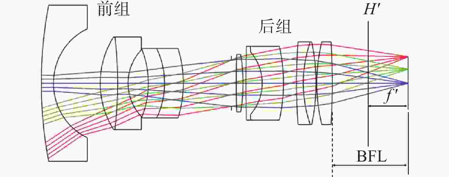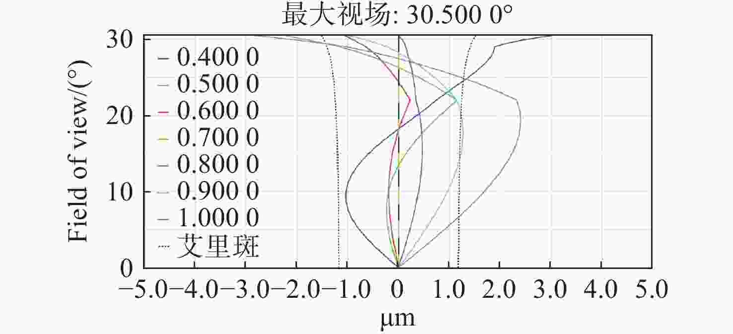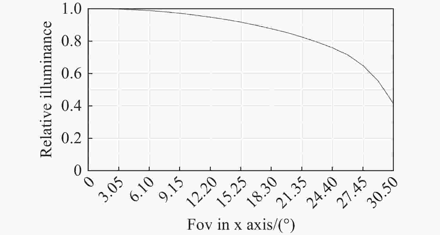 设计参数 参数值 视场/(°) 61 工作波段/nm 400~ 1000 焦距/mm 27 F数 1.38 3×3像元能量集中度 >80% 探测器靶面尺寸/mm 22.5×22.5 探测器像元尺寸/μm 11 倍率色差/μm <8 温度范围/°C 10~30 相对畸变 <4% 边缘视场照度 >40% 表 2 不同类型光学系统对比分析