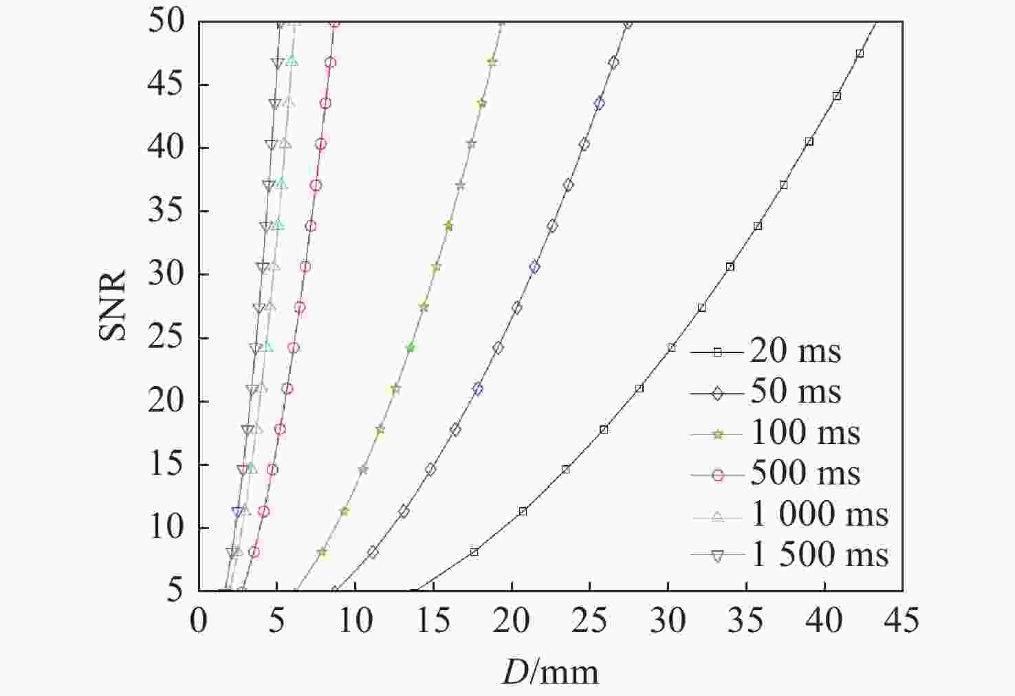 公差分析结果统计 标准点列图(RMS)/μm 3×3像元能量集中度 90% 优于12.13 大于81% 80% 优于10.93 大于87% 50% 优于8.801 大于91% 20% 优于7.18 大于94% 10% 优于6.50 大于97% 表 8 某一特定空间目标不同距离处探测器响应度