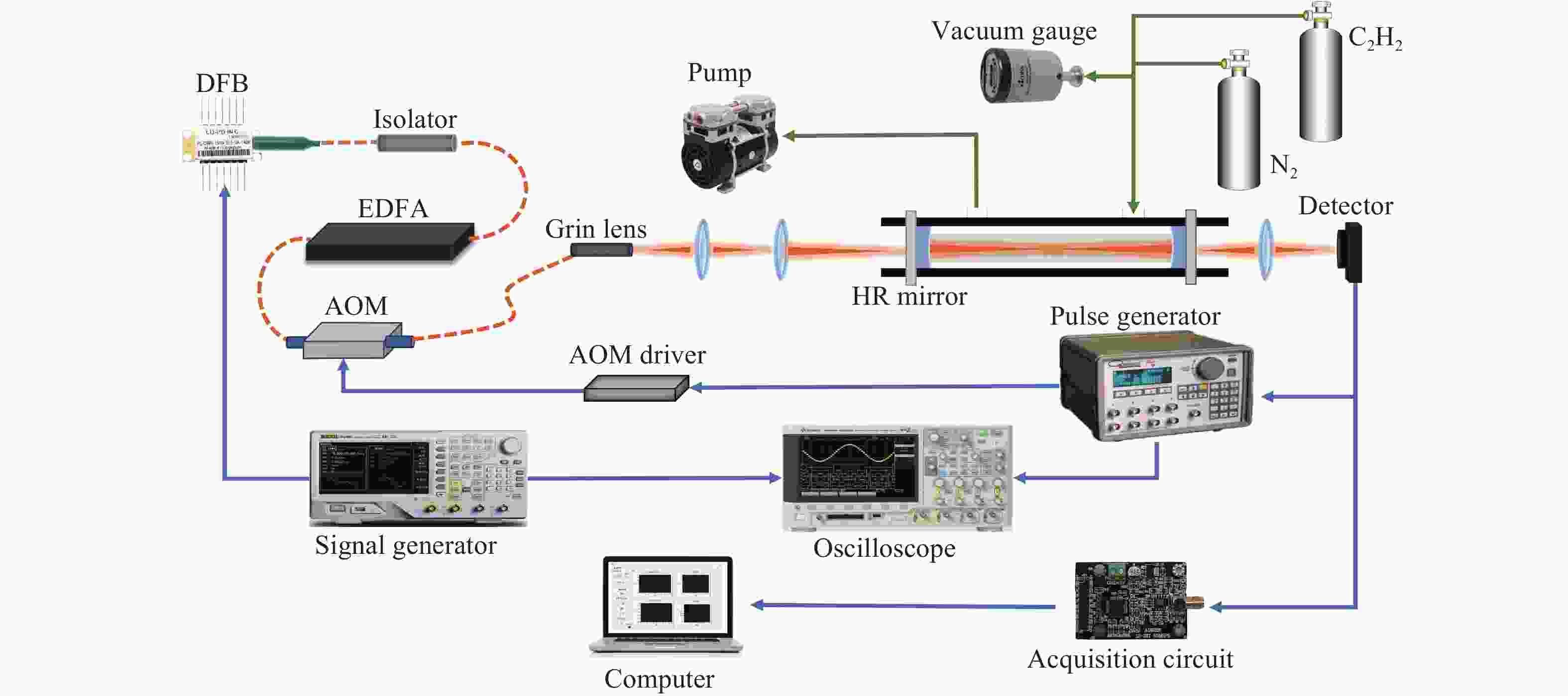 金宝搏188软件怎么用 吸收光谱技术因具有高灵敏度、快速响应和实时在线检测等优势,在大气环境监测、工业生产、医疗诊断等领域得到广泛应用。谱线混叠干扰是金宝搏188软件怎么用 吸收光谱技术面临的主要问题之一,针对该问题,本文提出了一种基于腔衰荡光谱(CRDS)的多谱线光谱分析方法,搭建了基于自主设计笼式结构的Fabry-Pérot腔的腔衰荡光谱(CRDS)气体检测系统,并选取乙炔(C2H2)在6452 cm−16453 cm−1范围内的7条吸收谱线作为研究对象进行实验。实验结果表明,该系统能够精确测量并拟合C2H2的多谱线吸收光谱,最低检测极限为3.517×10−8 cm−1,对应C2H2气体的最小检测体积比为4.37×10−6。此外,利用定标过的高精度真空计测量腔内压强,结合气体吸收光谱的压力展宽效应,精确计算了3条谱线的压强展宽系数,相对偏差均低于0.04。本研究为金宝搏188软件怎么用 吸收光谱技术中的多谱线分析提供了一种新的方法,提高了测量准确性和适用性。
