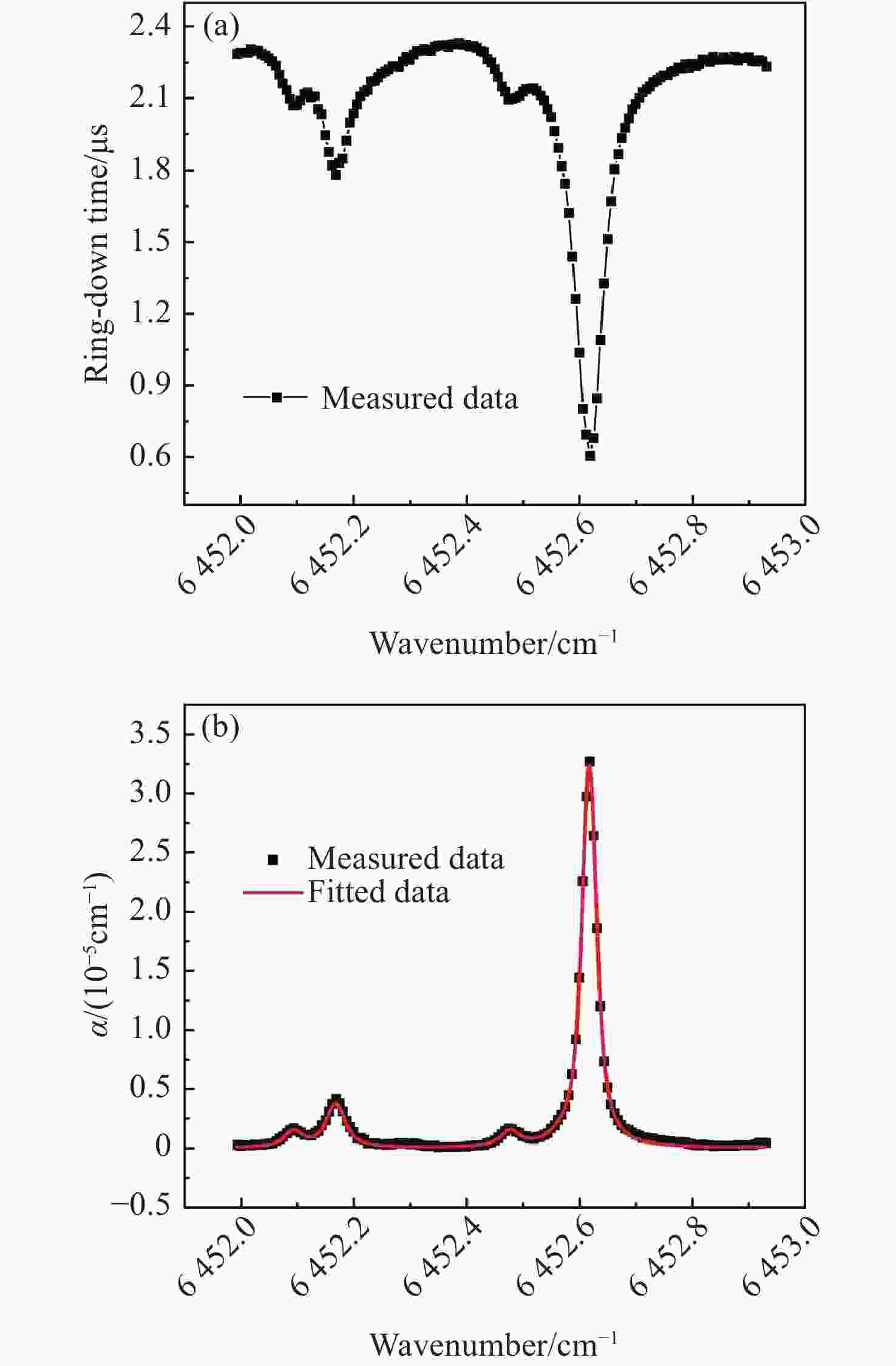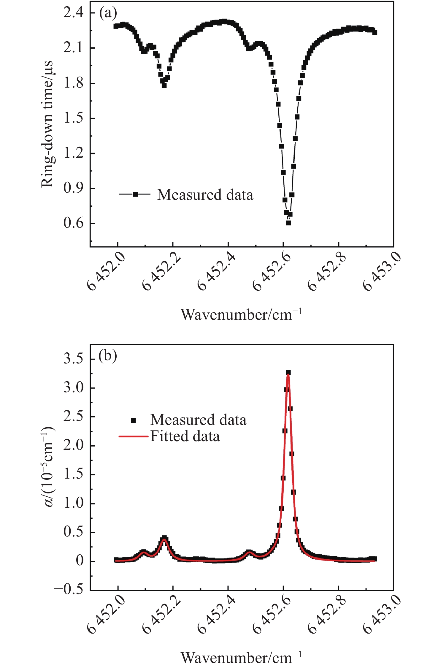 Figure 3.  (a) Curve of ring-down time; (b) absorption coefficient curve and its fitting curve