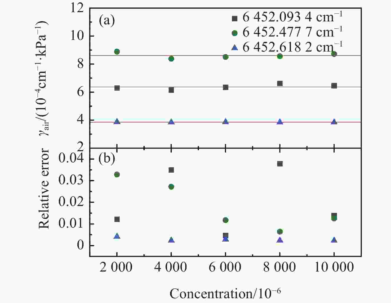 Figure 8.  Pressure-broadening parameter and relative deviation of three absorption lines at different concentrations