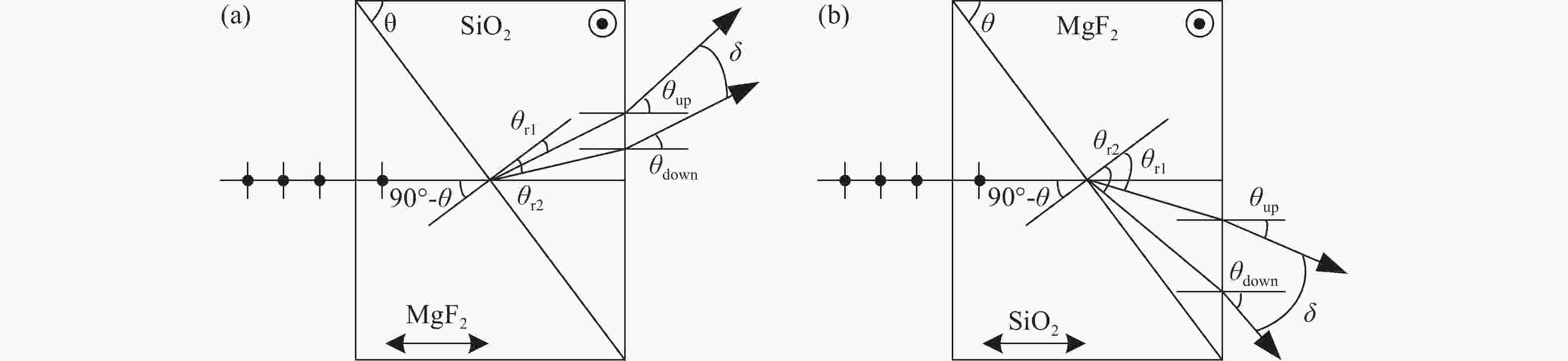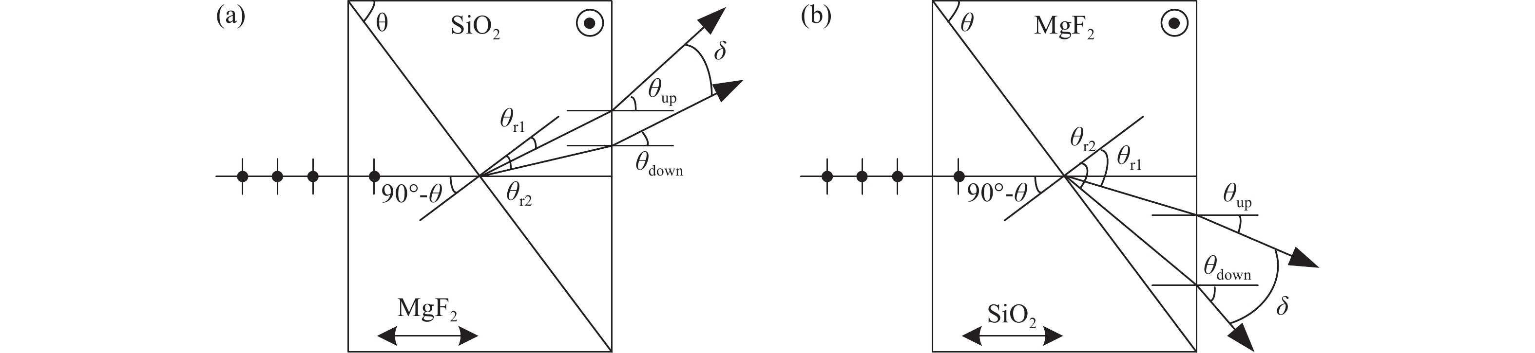Figure 8.  Optical path of the Rochon prism made of two types of positive crystal: (a) magnesium fluoride and quartz; (b) quartz and magnesium fluoride
