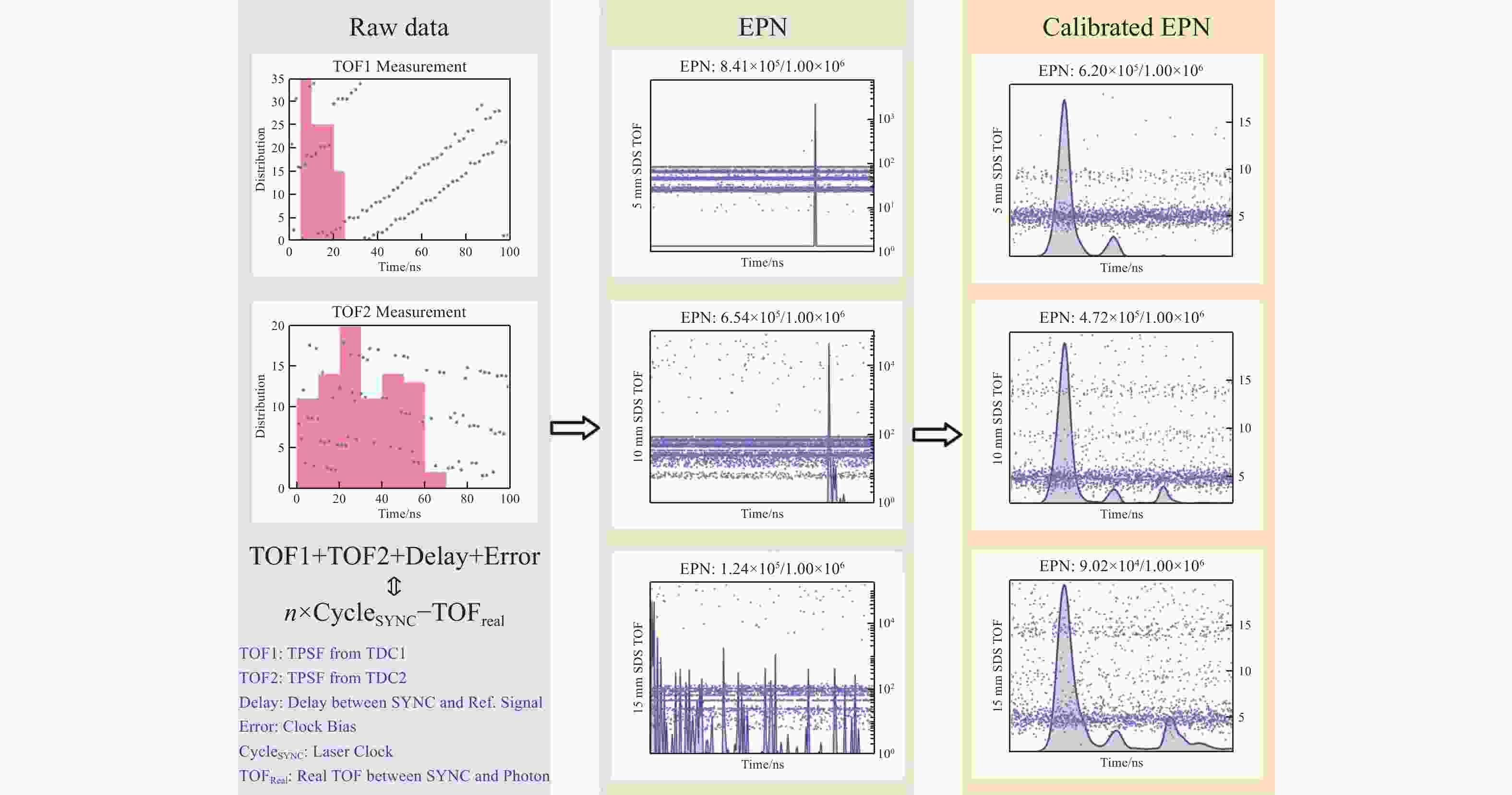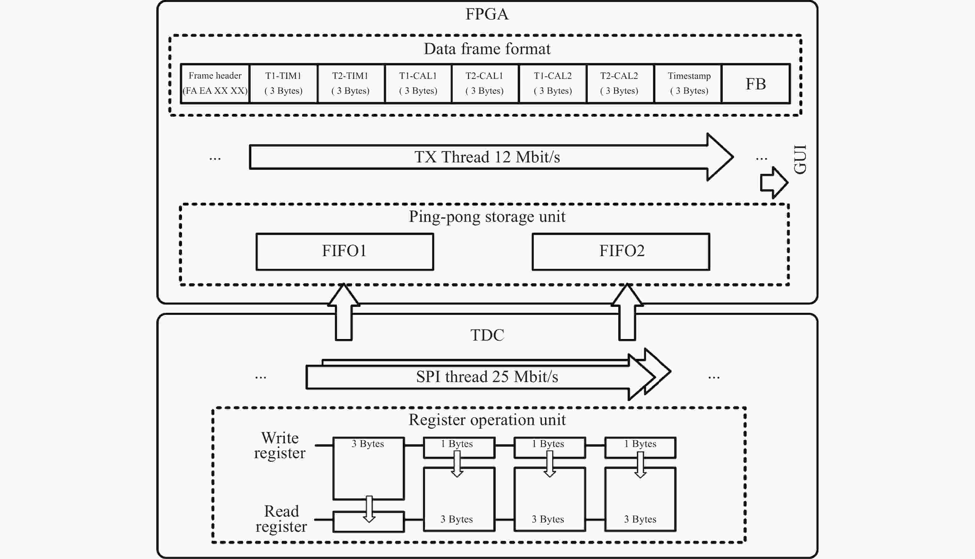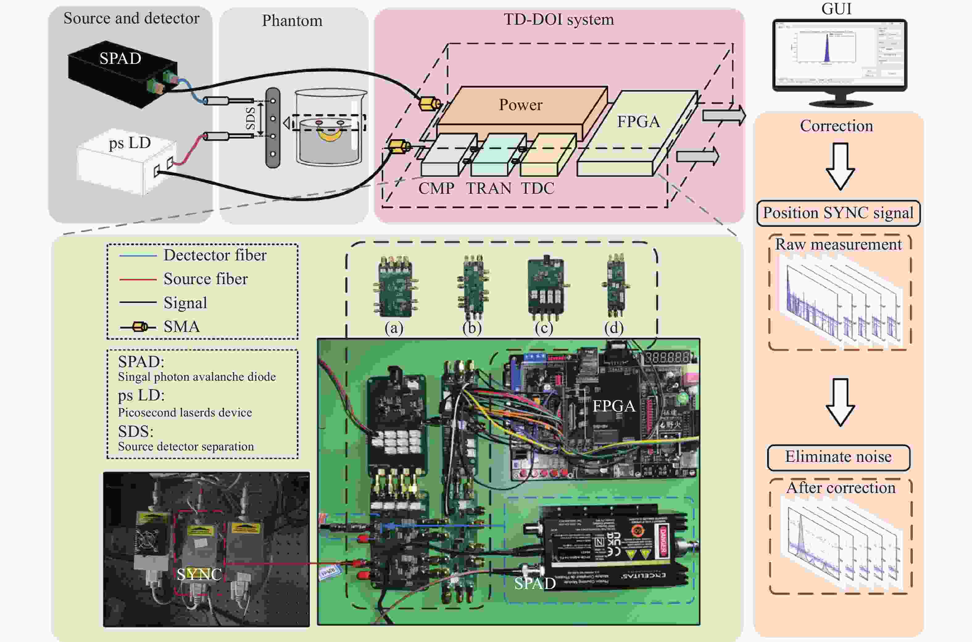 时域扩散光学成像(time domain diffuse optical imaging, TD-DOI)作为一种先进的组织光学成像技术,通过时间相关单光子计数(time-correlated single photon counting, TCSPC)系统可实现生物组织吸收系数与散射系数的定量重建,从而精确评估组织氧代谢、血流灌注等关键生理参数。然而,受限于TCSPC系统固有的硬件复杂性、高成本特性,目前难以实现临床场景下在体多通道动态监测的规模化应用。本文发展了一种双通道差分混合触发参考信号策略,通过结合差分时间数字转换(time-to-digital converter, TDC)器件和光子计数技术,构建稳定可靠的时间扩展曲线(time point spread function, TPSF)测量体系,实现了金宝搏188软件怎么用 同步信号与出射光子信号时间延迟的亚纳秒级精确标定。实验验证数据显示,所发展系统时间分辨率为55 ps,在2.3×104 光子/s计数率下,TPSF波动系数可稳定控制在1.35%以内(积分时间1 s)。针对组织仿体的光学参数反演测试表明,组织光学参数反演精度方面,吸收系数与约化散射系数的平均反演误差分别在5.39%和4.34%以内。该技术方案显著提升了TD-DOI多通道并行检测可行性,特别适用于脑皮层血氧饱和度动态监测等生物医学场景,为开发新一代穿戴式光学脑功能成像设备奠定了技术基础。