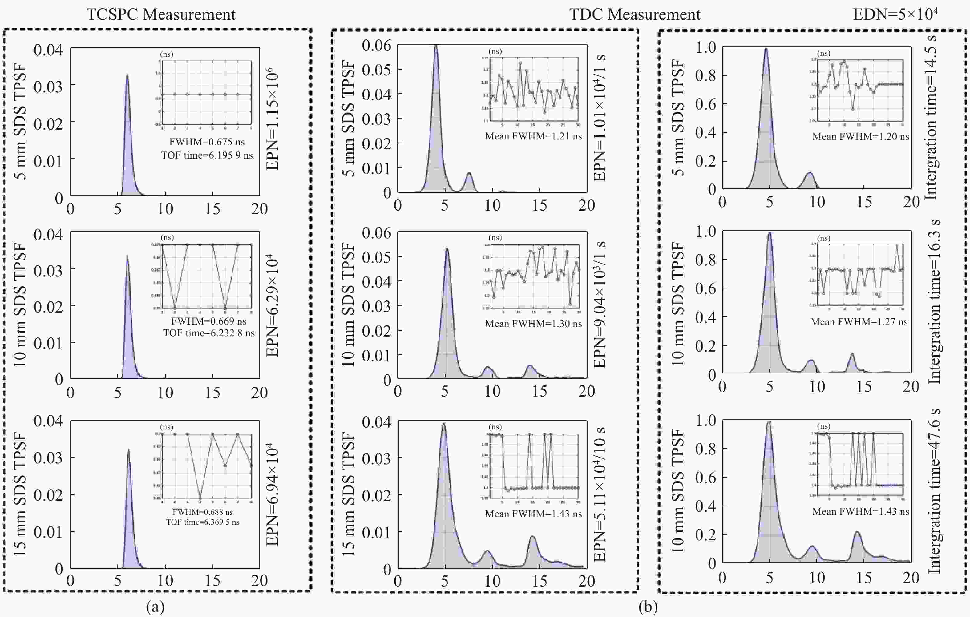 图 6 不同源探距离系统时间飞行曲线稳定性对比测试结果。(a)TCSPC 在不同源探距离配置下 TPSF 曲线;(b)TDC 在不同源探距离配置下 TPSF 曲线