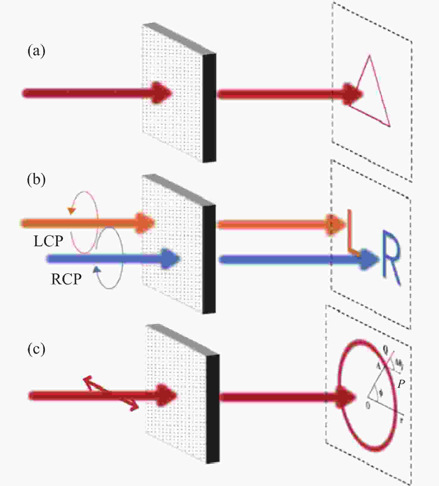 Figure 1. Schematic diagram illustrating the realization of different imaging fuctions through various geometric phase designs. (a) Achieving of arbitrary curve imaging on focal plane; (b) qualitative detection of the polarization type of incident light; (c) quantitative detection of the polarization direction of linearly polarized light, where A is the j-th point on the circle, AP is the direction of the incident linearly polarized light, AQ is the direction of the linearly polarized light at point A, and AQ passes through the center of the circle