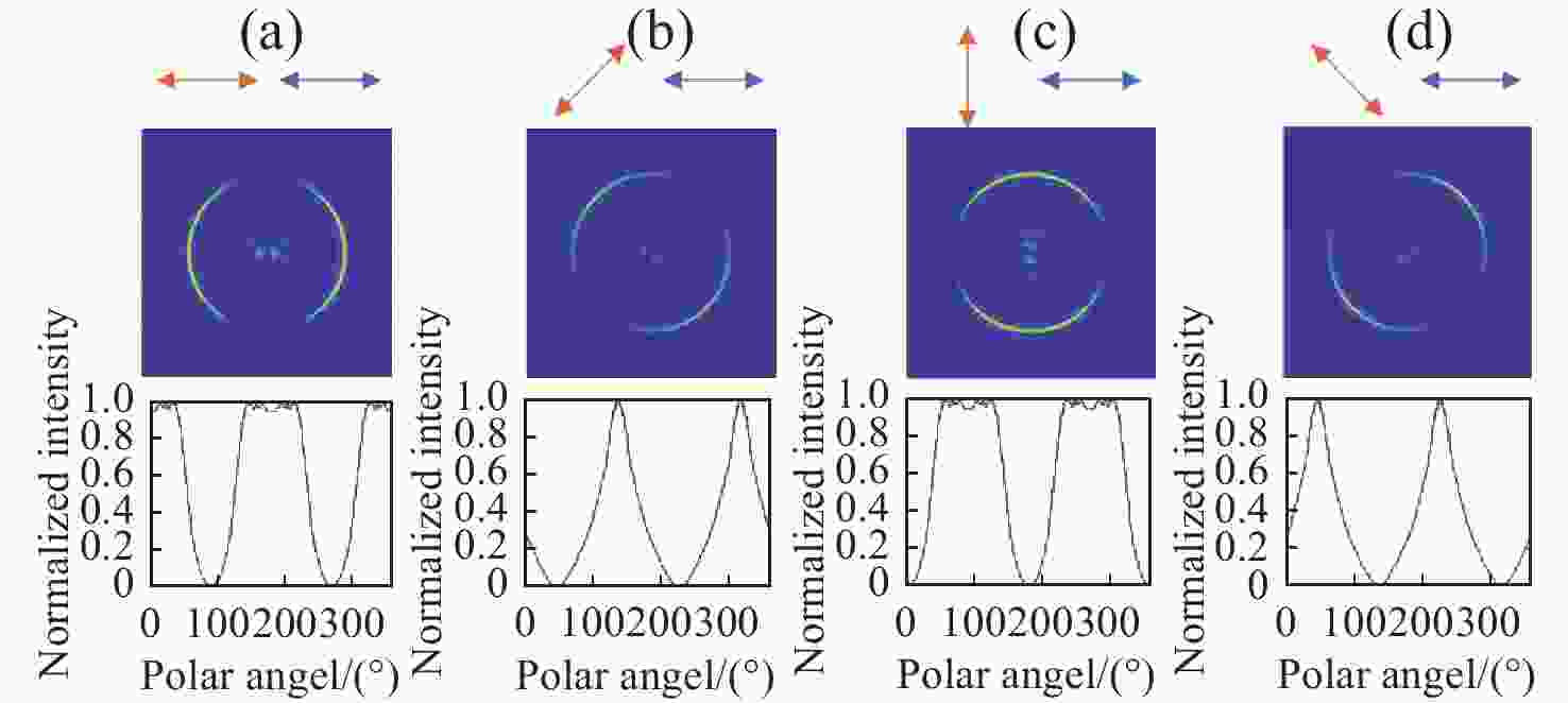 $\varphi $ 。(a) θ=$ 0 $ ,(b) θ=$ \dfrac{\mathrm{{\text{π}} }}{4} $ ,(c) θ=$ \dfrac{\mathrm{{\text{π}} }}{6} $ ,(d) θ=$ \dfrac{3\mathrm{{\text{π}} }}{2} $ Figure 6. Illustrates the schematic diagram for measuring the polarization rotation angle. The incident polarization angle is θ and the polar coordinate azimuth angle is