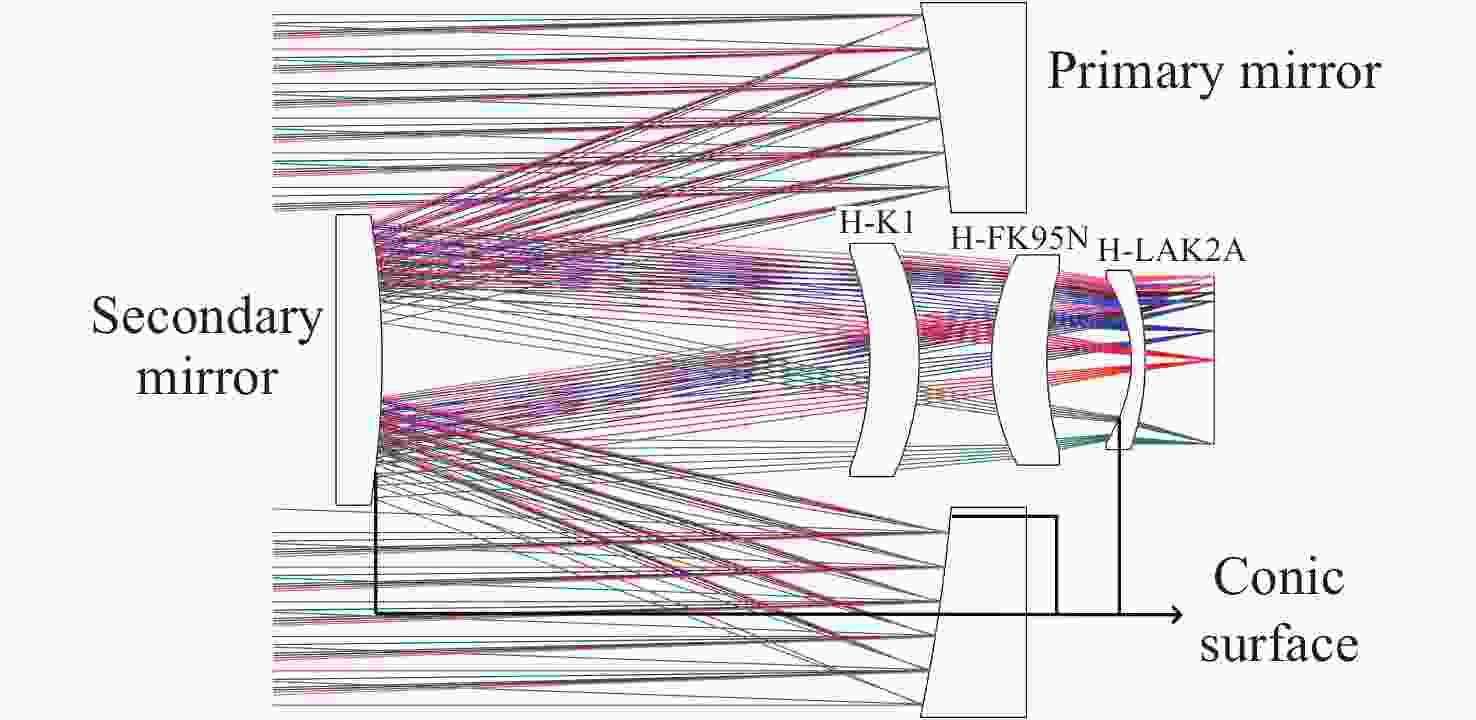 (mm)Primary mirror Silicon Carbide 2.5 −342.72 −1.18 −113.62 −171.36 − 0.00584 75 Secondary mirror Silicon Carbide 2.5 −174.08 −5.94 114.62 −87.04 − 0.01149 25.2725 Lens 1 Silica 0.5 −64.04 \ 6.06 735.35 0.00136 8.3877 Air \ −55.35 \ 11.86 Lens 2 Silica 0.5 57.48 \ 6.06 393.72 0.00254 6.2007 Air \ 81.82 \ 16.24 Lens 3 Silica 0.5 −28.65 −1.11 4.35 -92.14 - 0.01085 2.5471 Air \ −94.60 \ 15.00 表 4 优化后光学系统结构参数