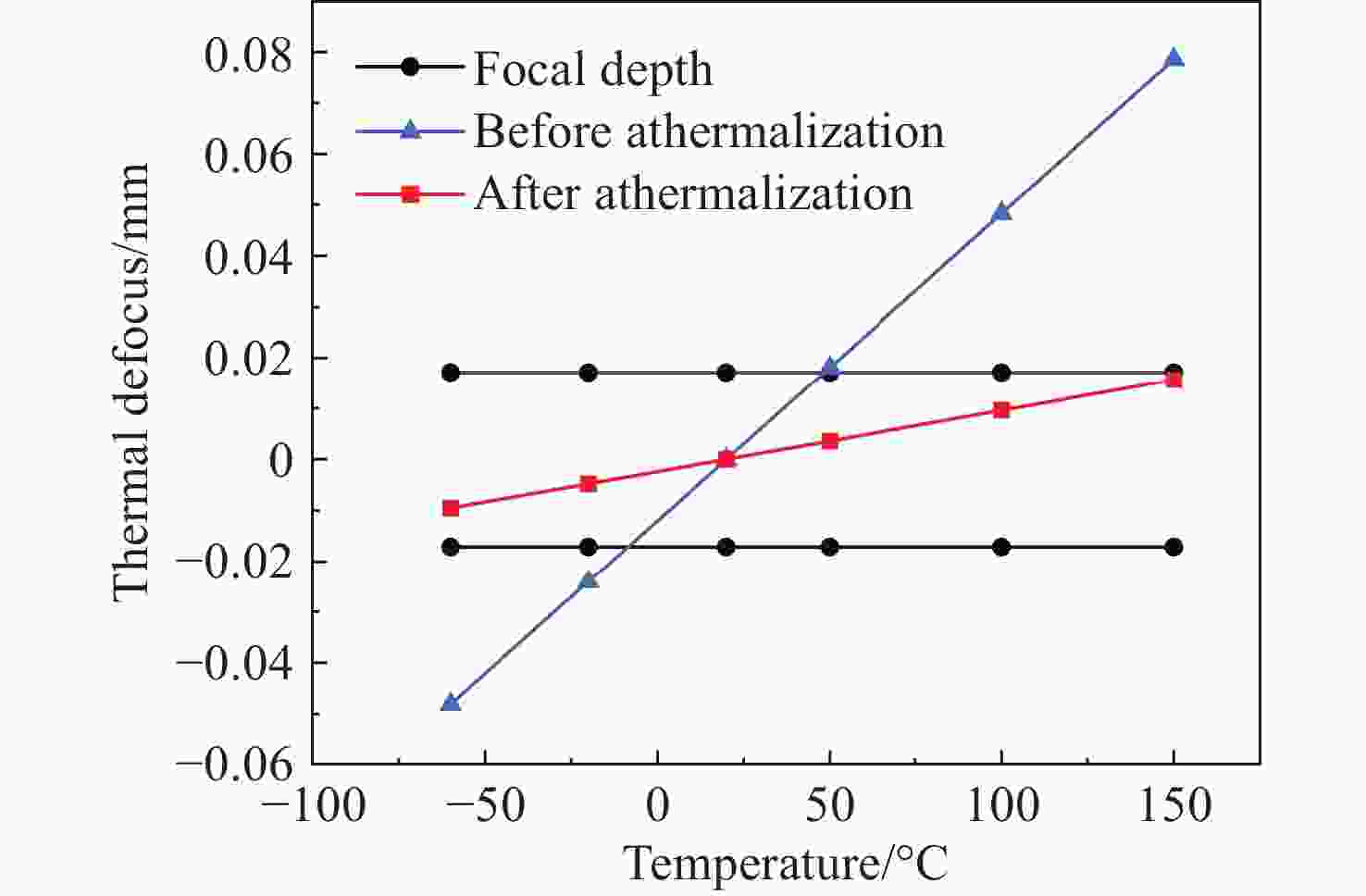 1000 nm波段,焦距为525 mm,F数为3.5的空间相机为设计对象,通过选择合适的反射镜基底材料和支撑结构材料,只使用熔融石英一种透镜材料校正像差,从而确保折反式光学系统在空间环境运行的性能稳定性并实现宽温度范围无热化。最终仿真结果表明:空间相机经过设计优化后,在−60 °C~150 °C温度范围内奈奎斯特频率77 lp/mm处的调制传递函数值优于0.4。该相机的材料物理性能稳定、成像质量好、高低温环境内成像质量稳定,在空间探测等领域具有广泛的应用前景。Abstract:Catadioptric space cameras are widely used in space exploration. However, temperature variations can degrade their imaging performance. To address this issue, we present an athermal design for a catadioptric space camera operating over a wide temperature range. Initially, the temperature effects on optical elements, mechanical structures, and other components were analyzed, and convenient methods for thermal aberration compensation are summarized. Subsequently, taking a camera with a spectral range of 400–
