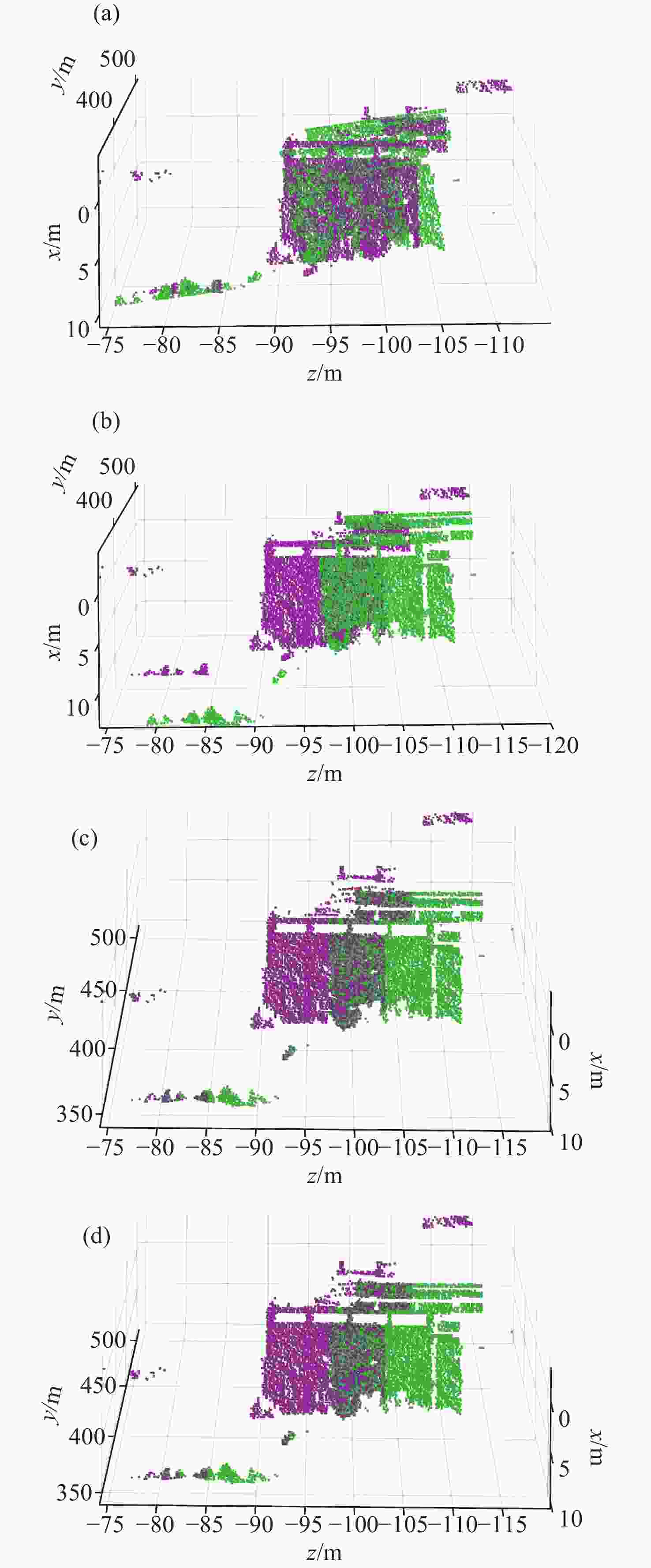 图 10 真实场景局部配准结果对比。(a)传统ICP;(b)改进ICP;(c)重叠点云提取结合传统ICP;(d)重叠点云提取结合改进ICP