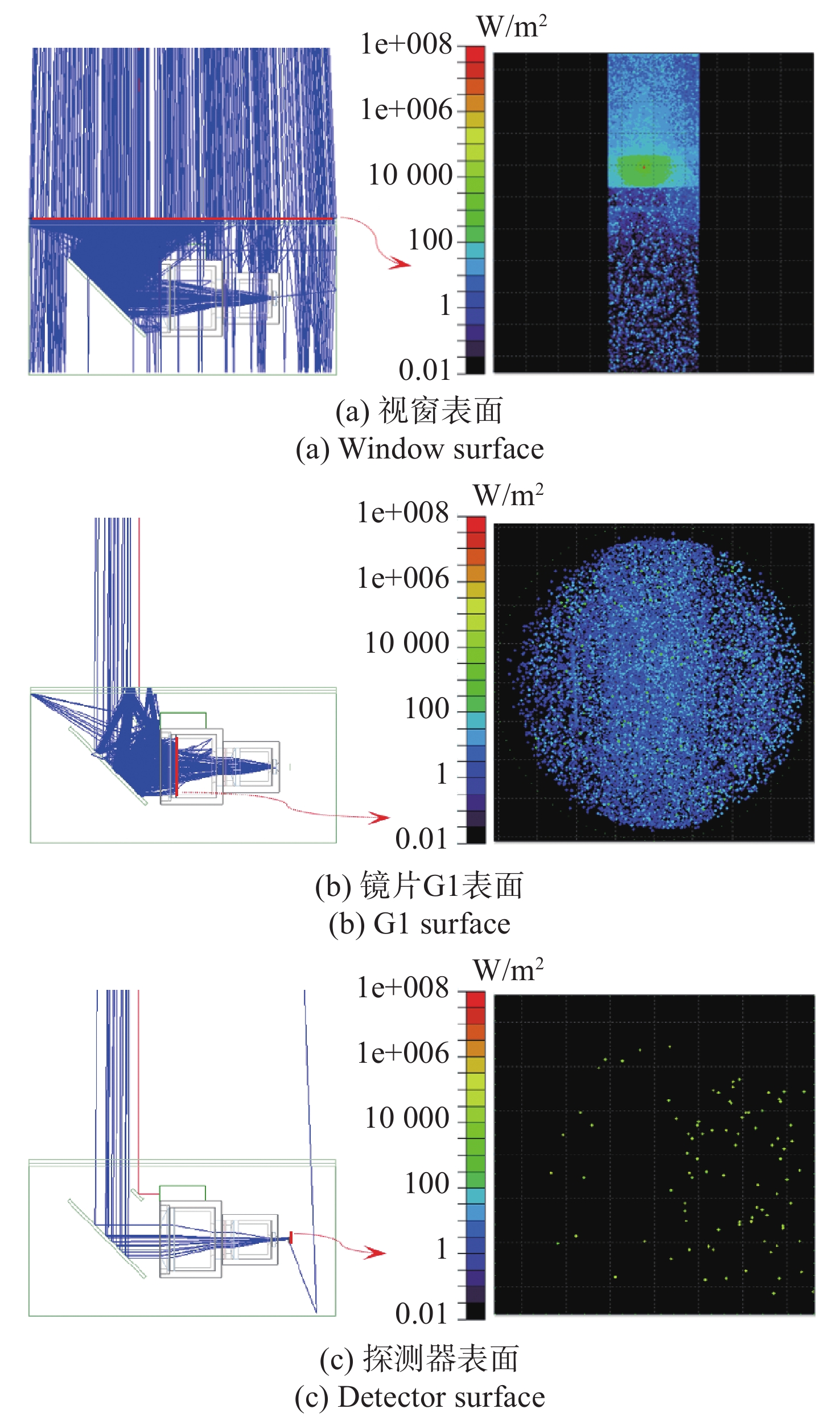 占比/%光线数/根 1 光源-反射镜1-视窗 94.9240 98.90 119401 2 光源-反射镜1-视窗-目标-视窗 0.0426 0.01 1129 3 光源-反射镜1-视窗-目标-视窗-反射镜2-G1 0.0035 29.75 107 4 光源-反射镜1-视窗-反射镜1-光源-反射镜2-G1 0.0027 22.54 1326 5 光源-反射镜1-视窗内部反射-反射镜1-光源-反射镜2-G1 0.0024 20.56 1342 6 光源-反射镜1-视窗-目标-视窗-反射镜2-G1-G2-G3-G4-G5-探测器 0.0019 86.44 77 7 光源-反射镜1-视窗-目标-视窗-反射镜2-G1-G2-G3-G4-G5非工作区-探测器 0.0003 13.47 12 表 2 镜头内主要光线路径
