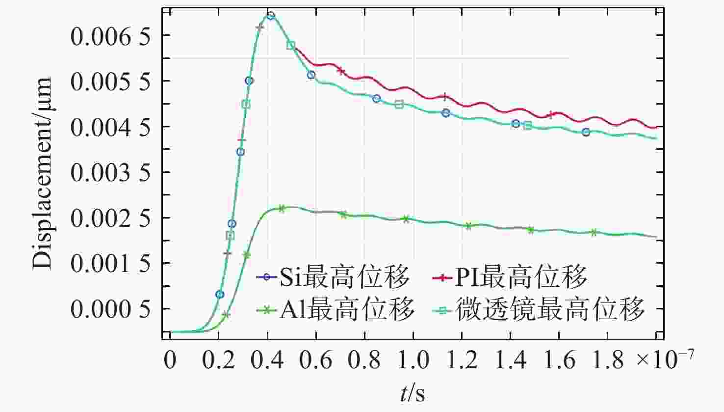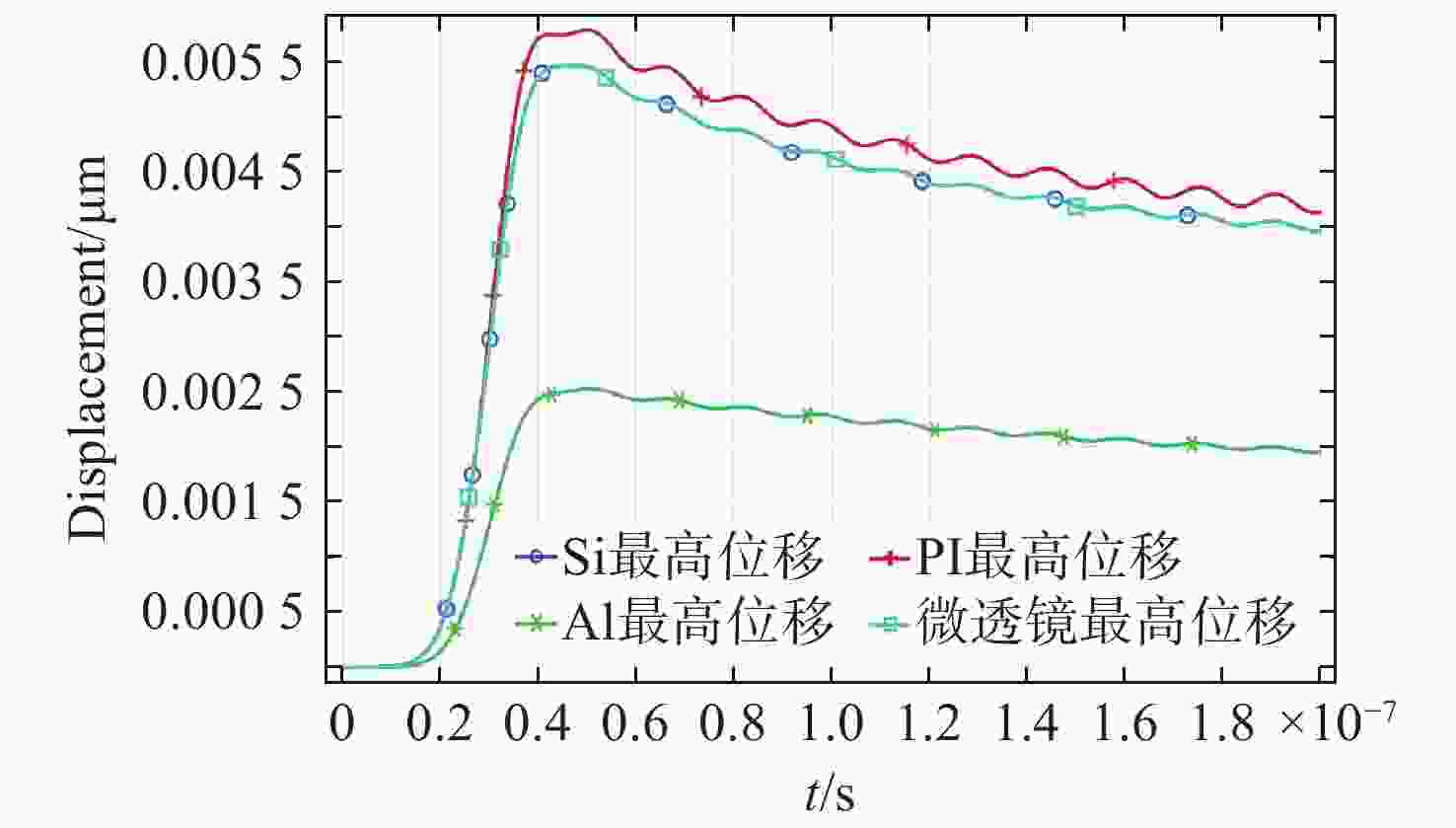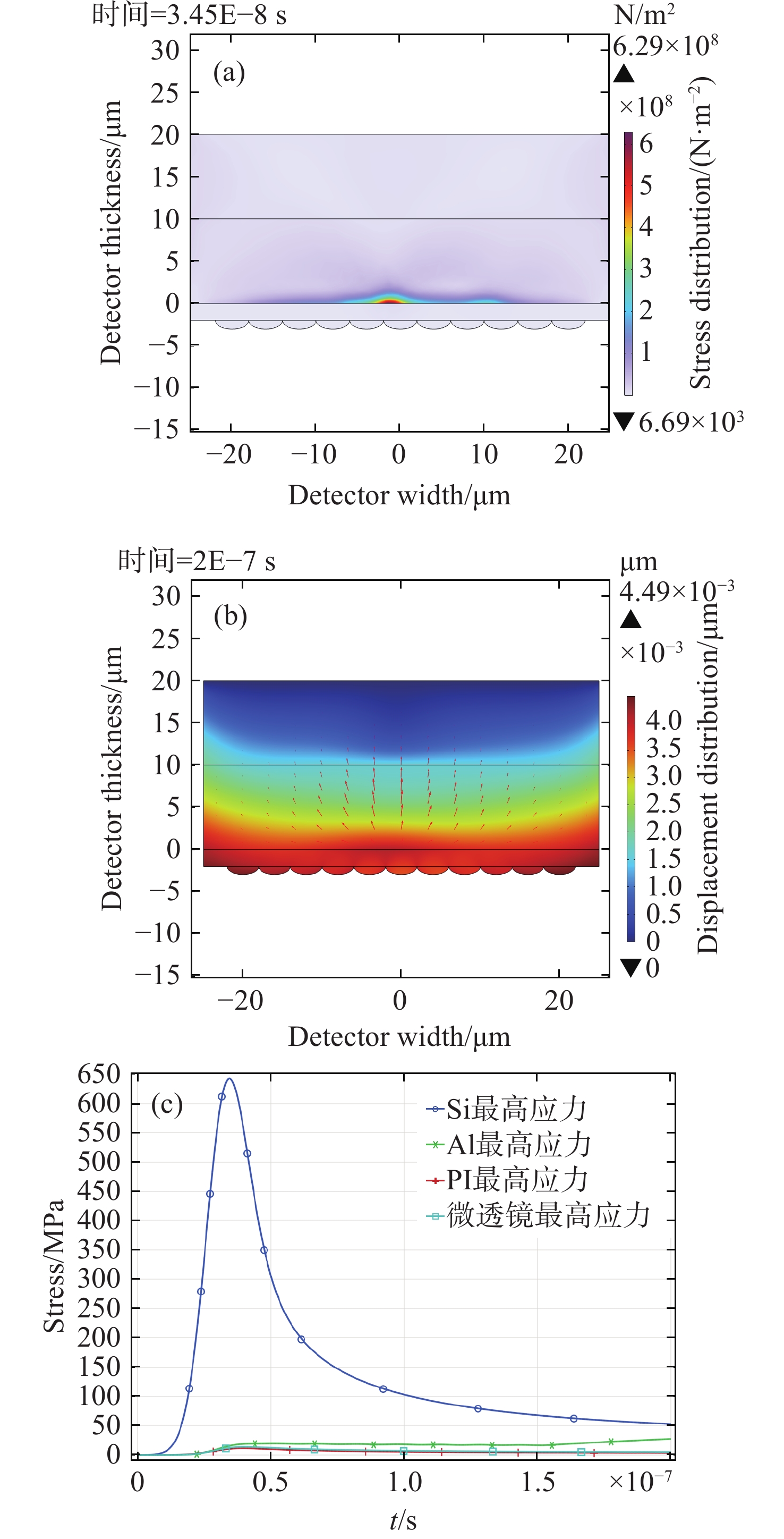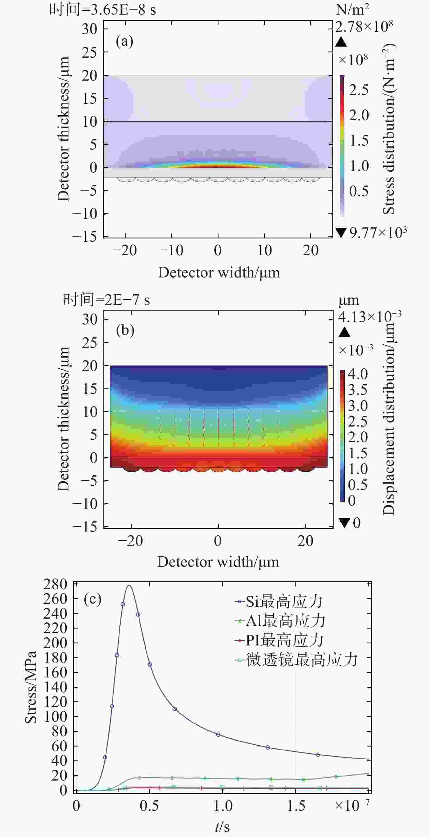 Figure 10.  Stress-strain simulation results of CMOS detector damage induced by 532 nm laser. (a) Maximum stress distribution; (b) maximum displacement distribution; (c) maximum stress curves for each layer