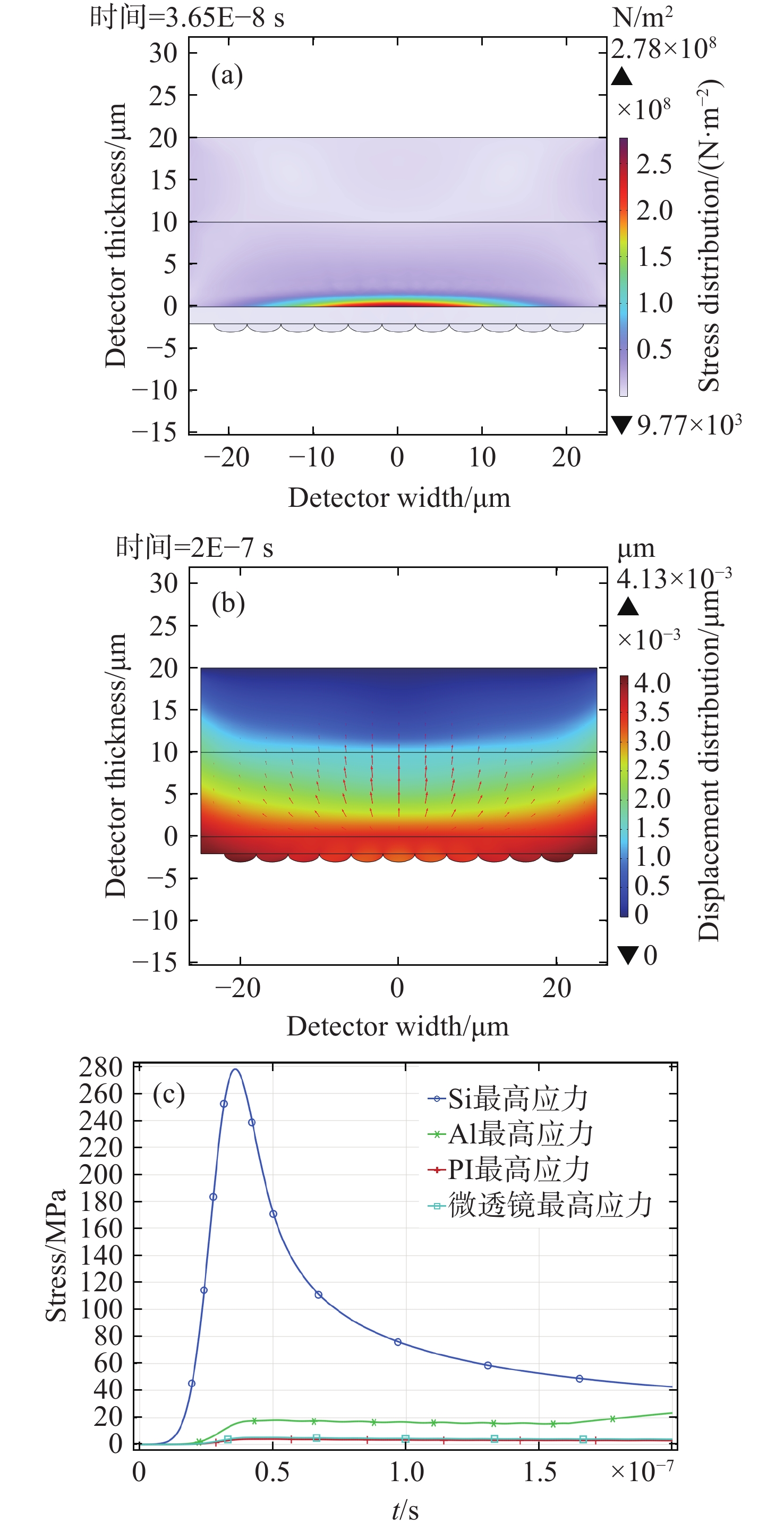 Figure 13.  Stress-strain simulation results of CMOS detector damage induced by 1064 nm laser. (a) Maximum stress distribution; (b) maximum displacement distribution; (c) maximum stress curves for each layer