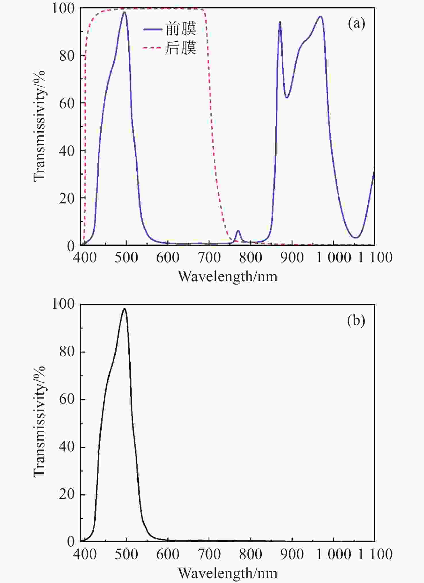 图 4  滤光片光谱曲线。(a)前膜和后膜各自光谱曲线,(b)前膜和后膜组合光谱曲线