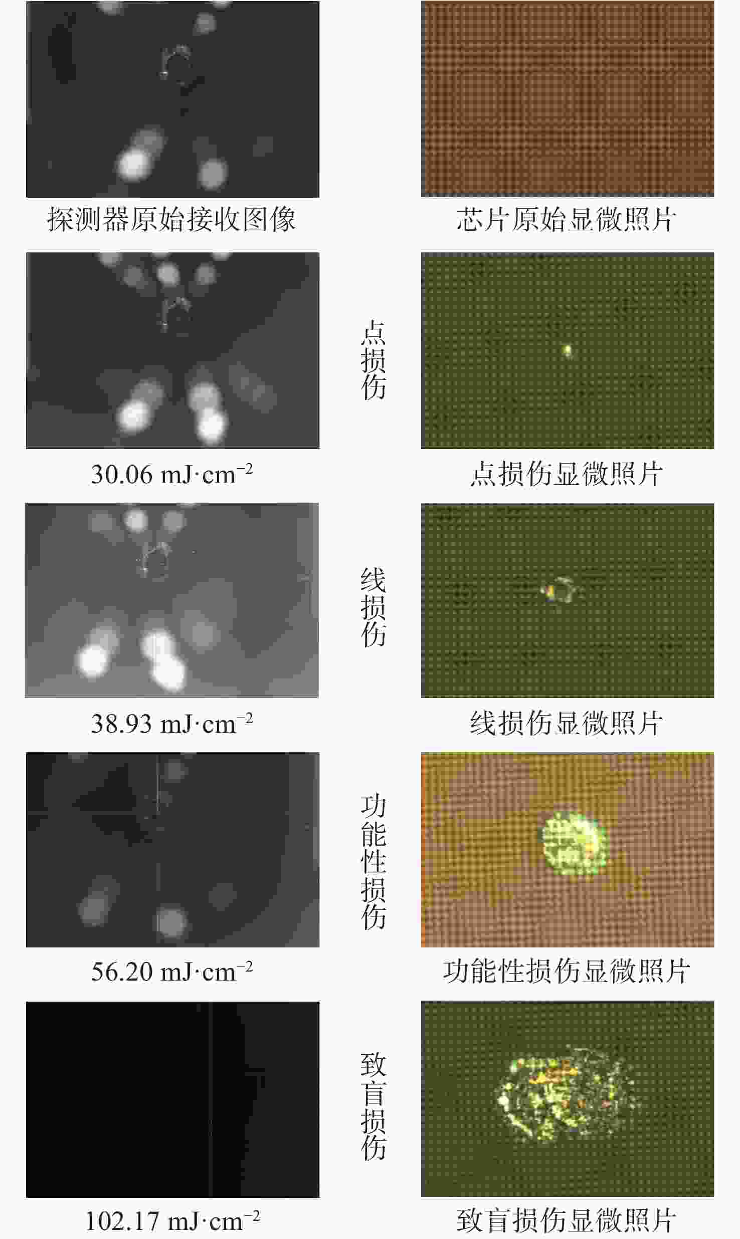 图 5  532 nm纳秒金宝搏188软件怎么用 辐照后,不同损伤程度的探测器接收图像和芯片损伤形貌