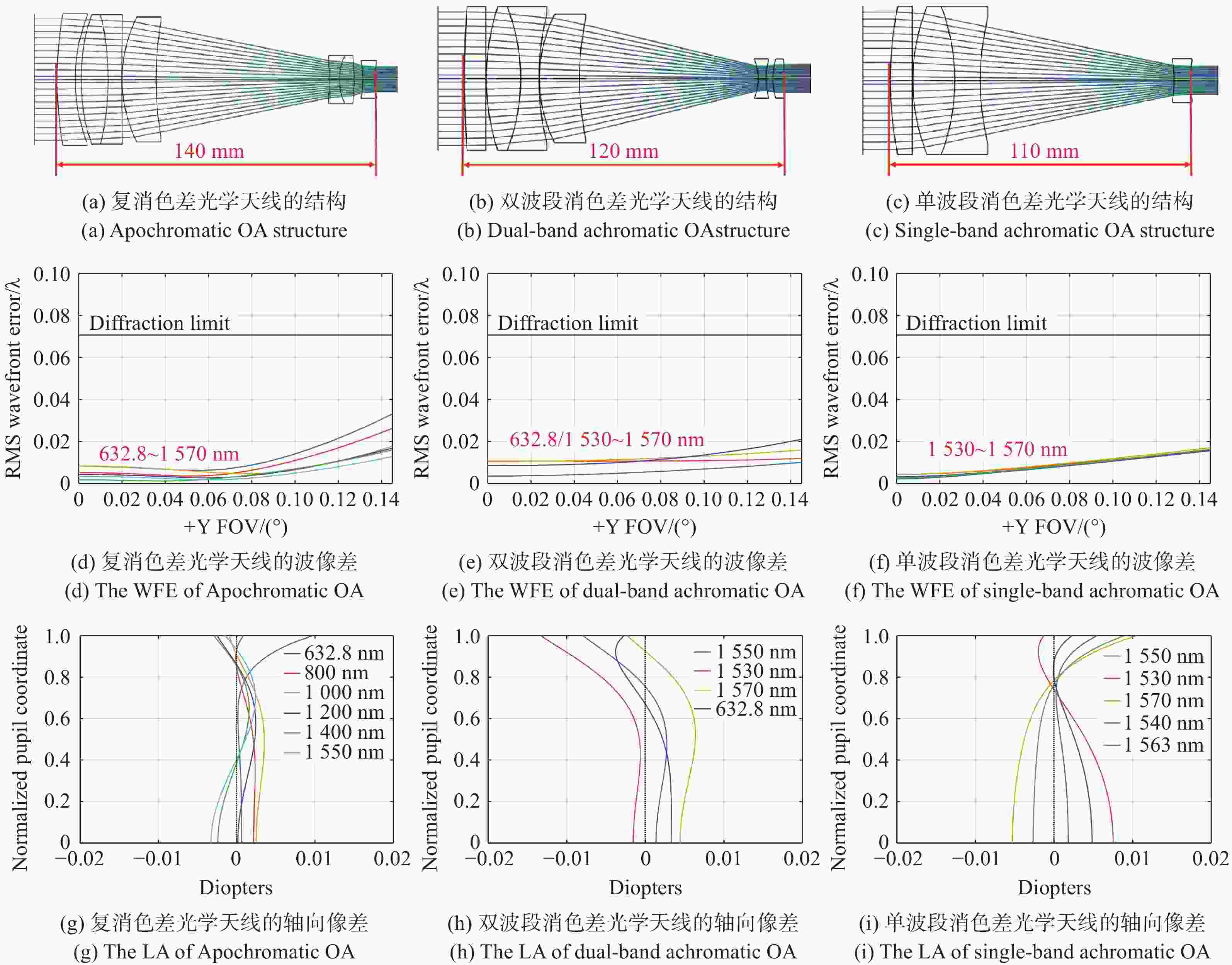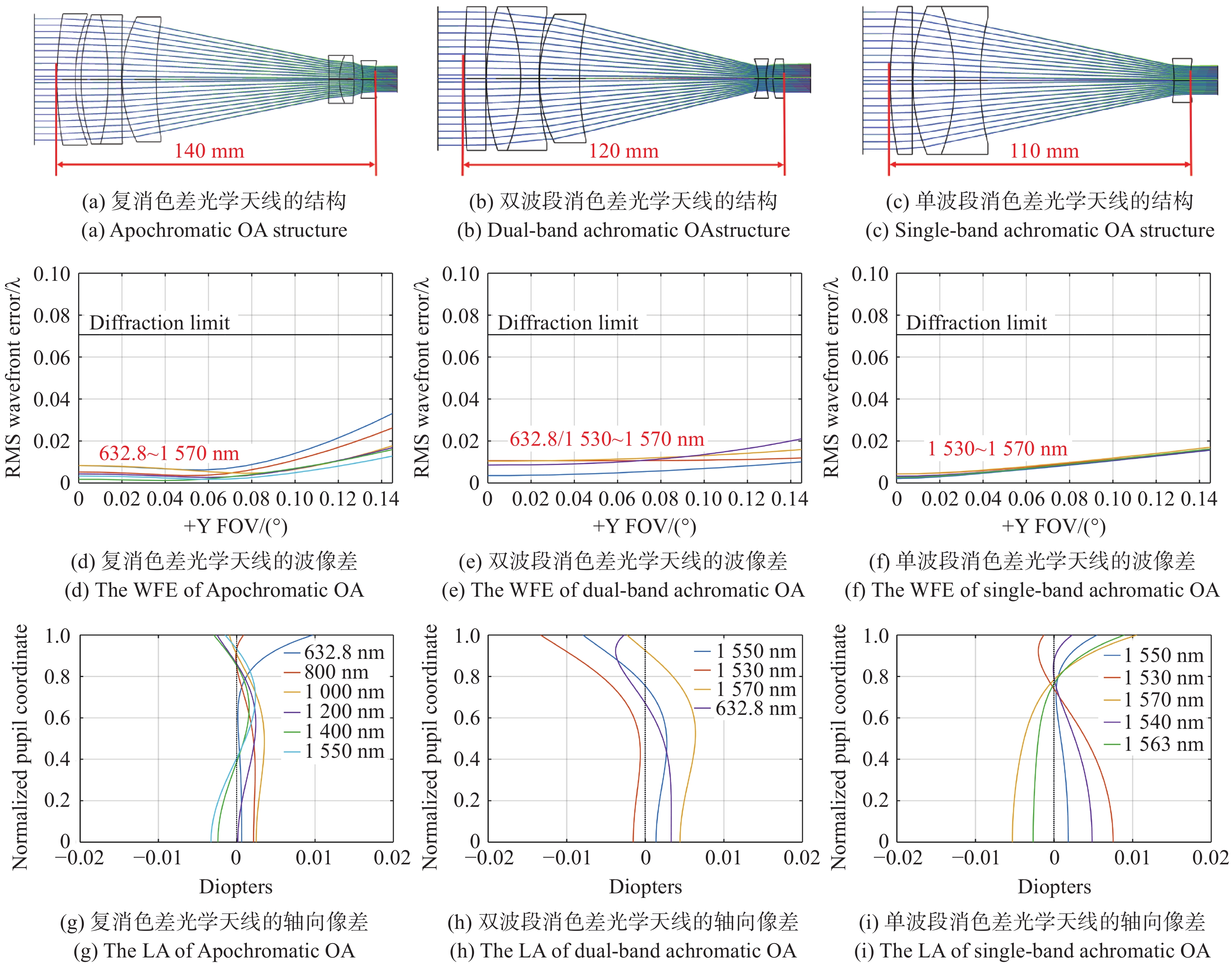 图 3  复消色差、双波段消色差以及单波段消色差光学天线的结构、波像差及轴向像差曲线