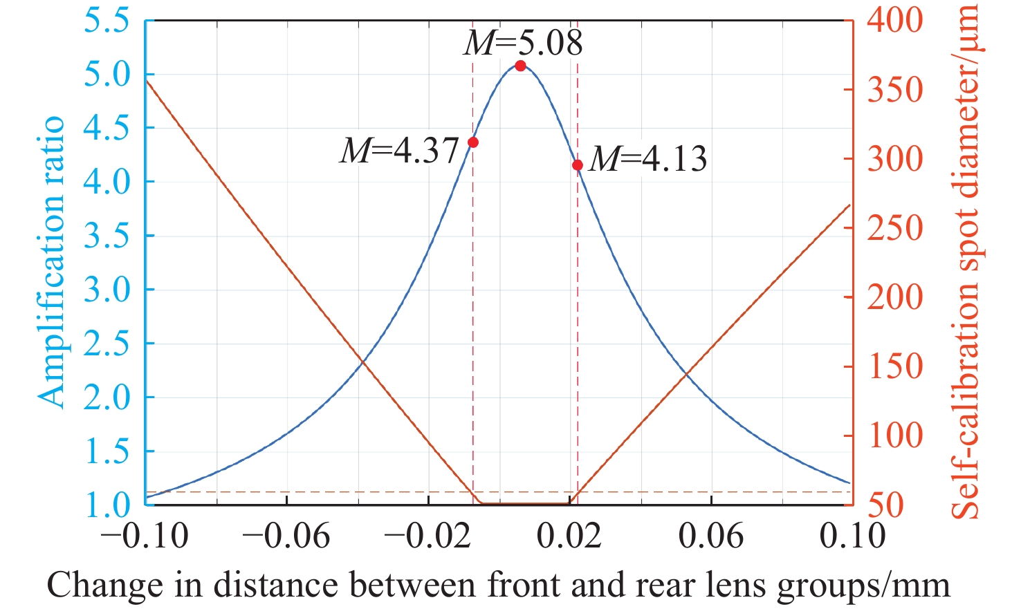Figure 9.  Variation of OA magnification and self-calibration spot diameter with the distance between front and rear groups