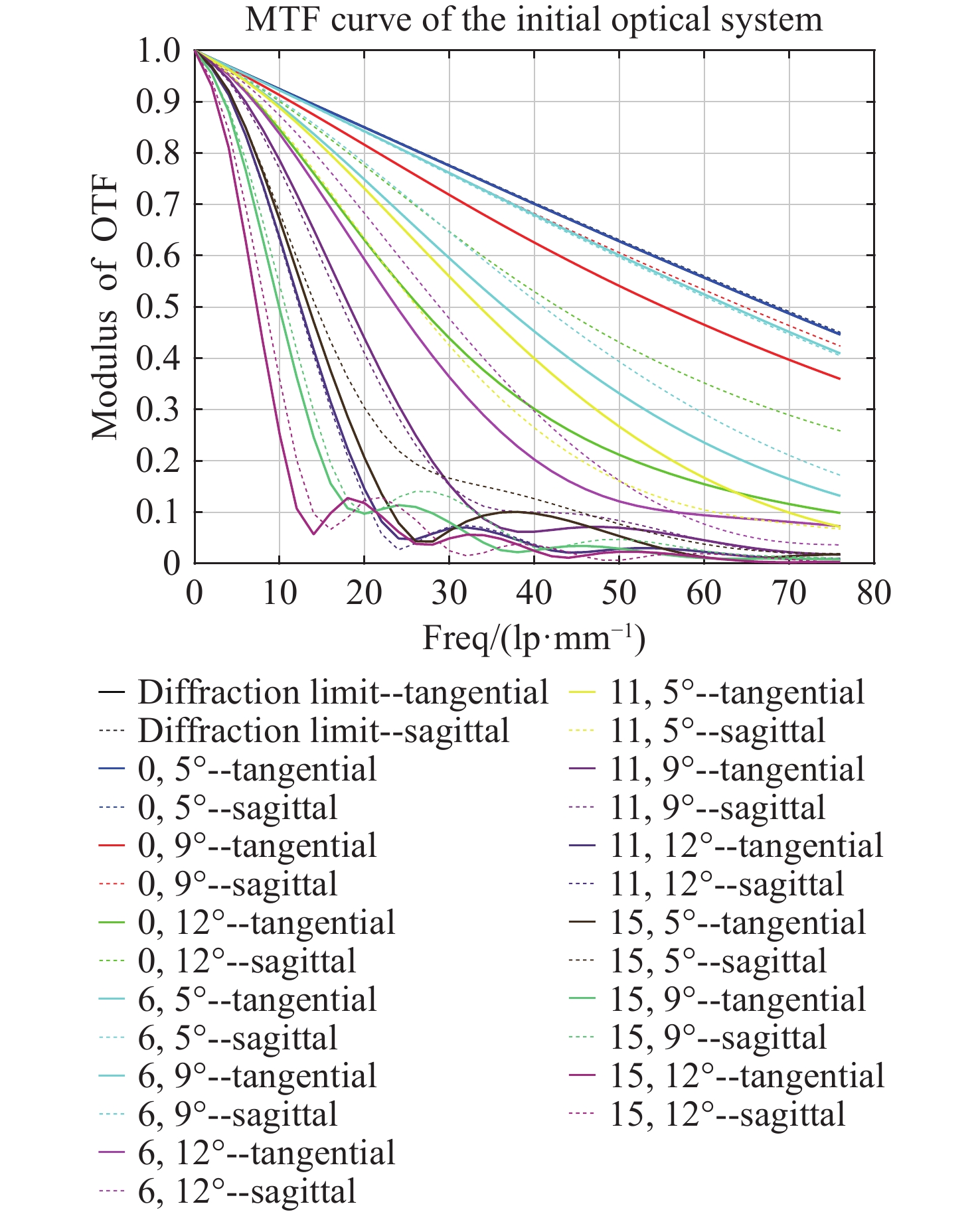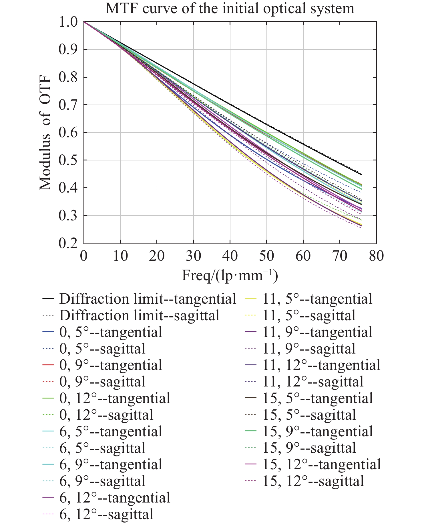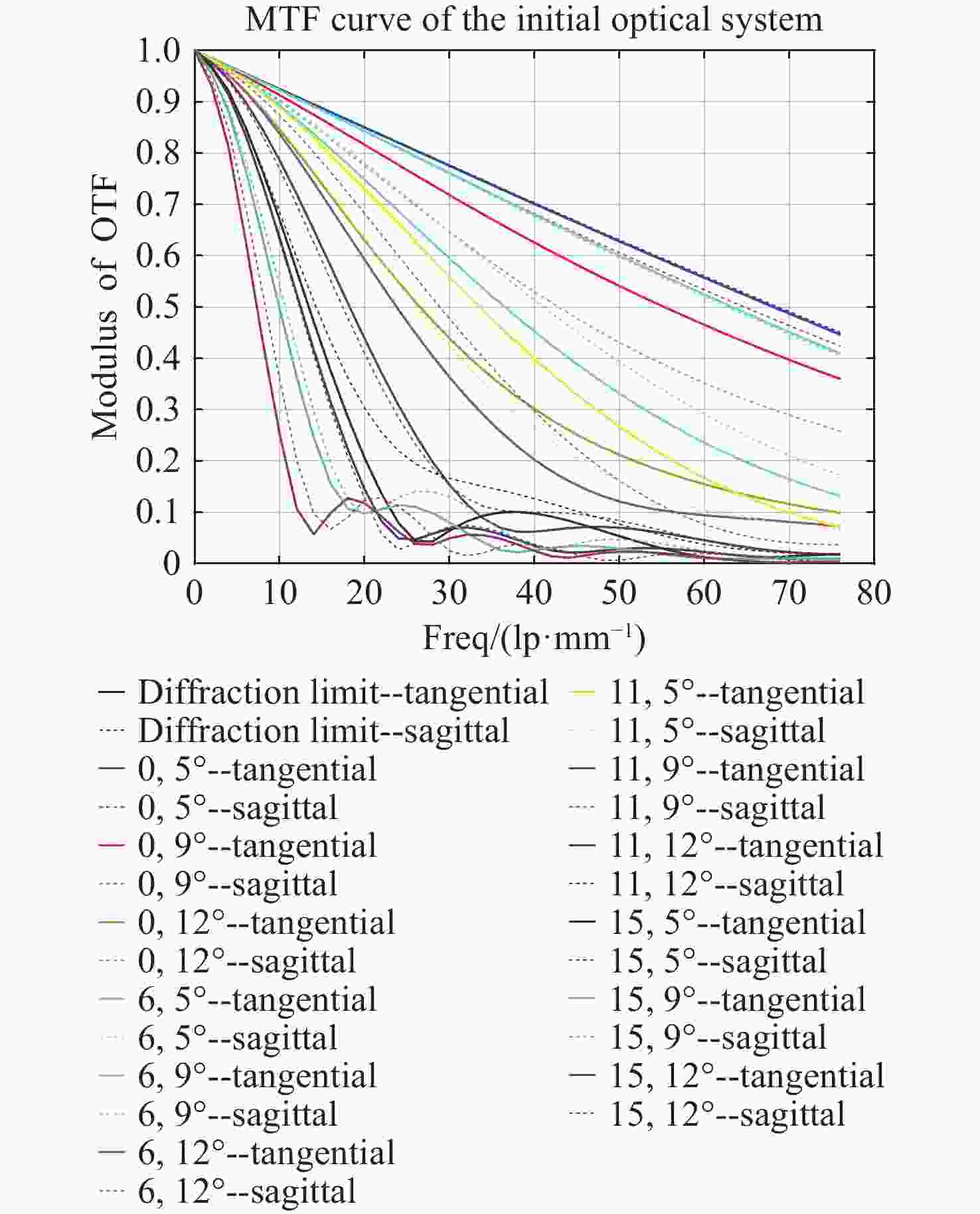 1.0816 ″、绕Z轴11.045″,表明光学系统具有较高热稳定性的同时也对无控条件下在轨测绘数据误差修正具有重要意义。Abstract:Off-axis reflective optical systems are widely employed in Earth observation and mapping owing to their advantages of wide field of view (FOV), high image quality, and stable interior orientation elements. However, conventional designs based on the point-by-point (PW) method often suffer from degraded off-axis imaging performance and thermally induced pointing drift. In this study, the third-order aberration coefficients of a three-mirror optical system are analytically derived under the condition that the aperture stop is located at the secondary mirror and that the primary and tertiary mirrors are equally spaced along the optical axis. To further enhance imaging performance, fourth-order aspheric terms are introduced on both the primary and tertiary mirrors, thereby increasing the degrees of freedom for optimization. A comprehensive image-quality evaluation function incorporating quasi-telecentric constraints is constructed, and a hybrid genetic algorithm-sequential quadratic programming (GA-SQP) approach is employed to obtain an optimized initial configuration. The resulting system achieves a focal length of 260 mm, an F-number of 10, and a 7° × 30° FOV, with a modulation transfer function (MTF) above 0.25 at 77 lp/mm, a maximum distortion of 2%, and a maximum chief-ray angle of 2.3°. Microcrystalline glass and titanium alloy are adopted as the mirror substrate and structural materials, respectively. Finite-element thermal analysis is performed under a 6.8 °C temperature gradient, and the optical axis rotation, evaluated using the TRIAD algorithm, is −0.728″ about the X-axis,