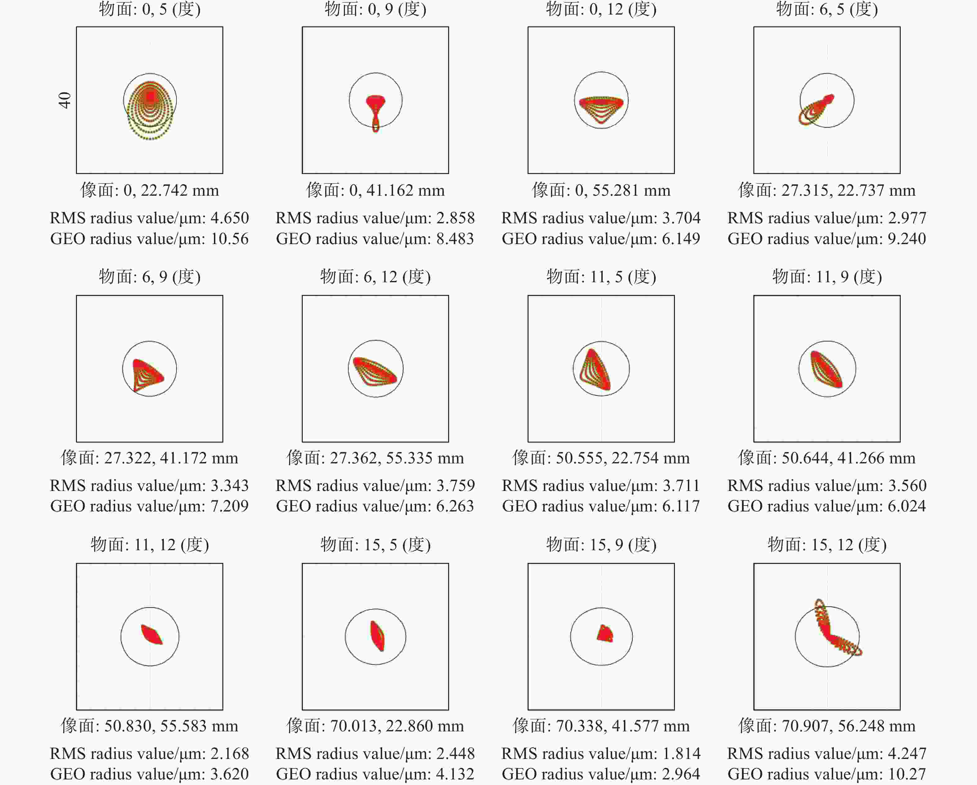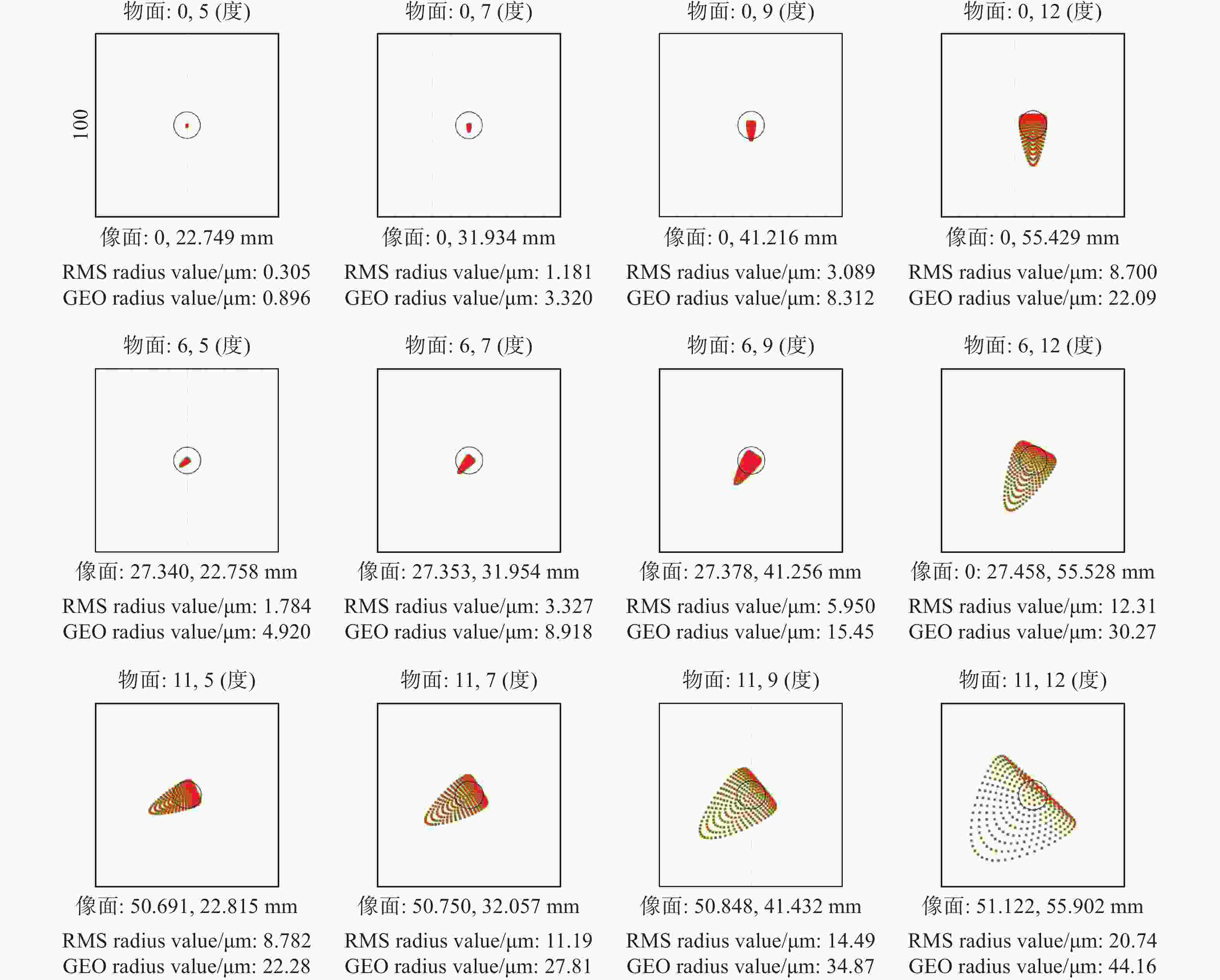名称 半径/mm 厚度/mm 圆锥常数 四次项 PM − 441.4465 − 119.3785 − 1.8096 − 8.71565 e-11SM − 154.9514 119.3785 − 0.7225 0 TM − 238.7571 − 162.7017 0.0952 8.92229 e-11表 6 局部优化后系统参数