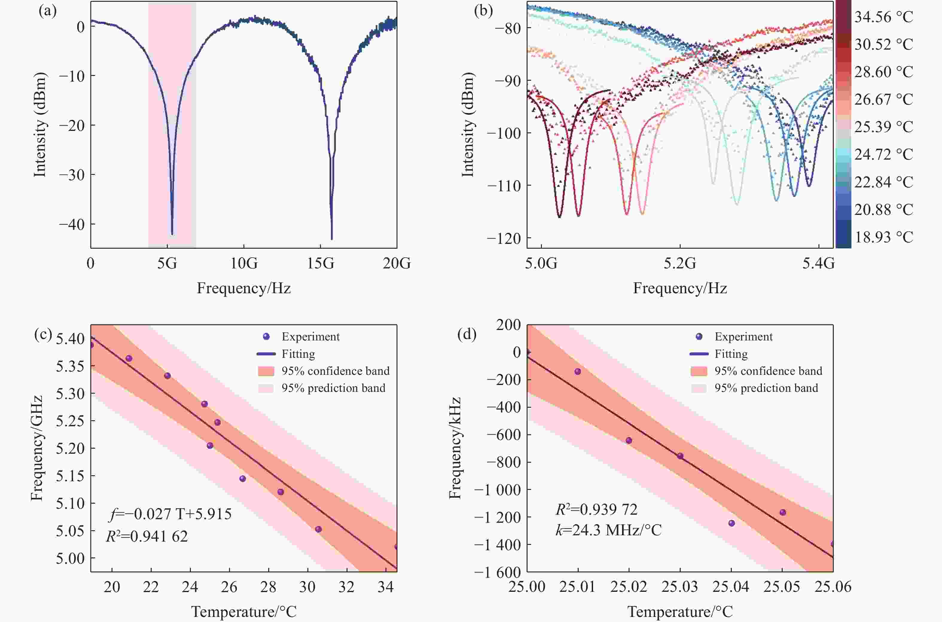 图 5 频移检测法。(a)0-20 GHz范围内的谐振谱;(b)18 °C至34 °C温度调制下的谐振频率偏移;(c)变化1 °C温度-频率的线性相关性及拟合函数;(d)变化0.01 °C温度-频率的线性相关性及拟合函数