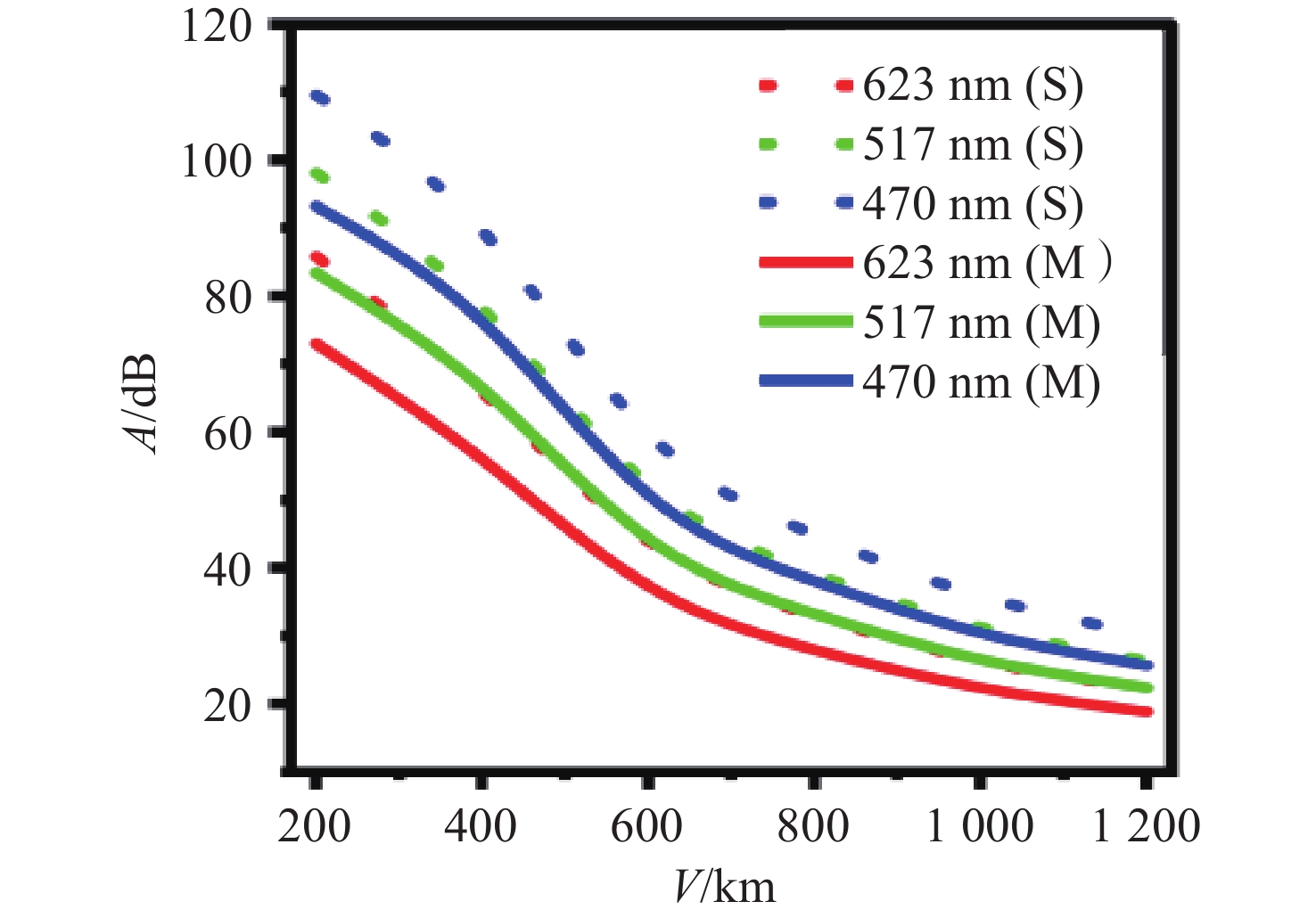 能见度红光(623 nm) $ \mu $ $ { \omega } $ $ {g} $ 1000 0.055 0.872 0.743 800 0.069 0.867 0.739 600 0.092 0.861 0.734 400 0.138 0.852 0.728 光学