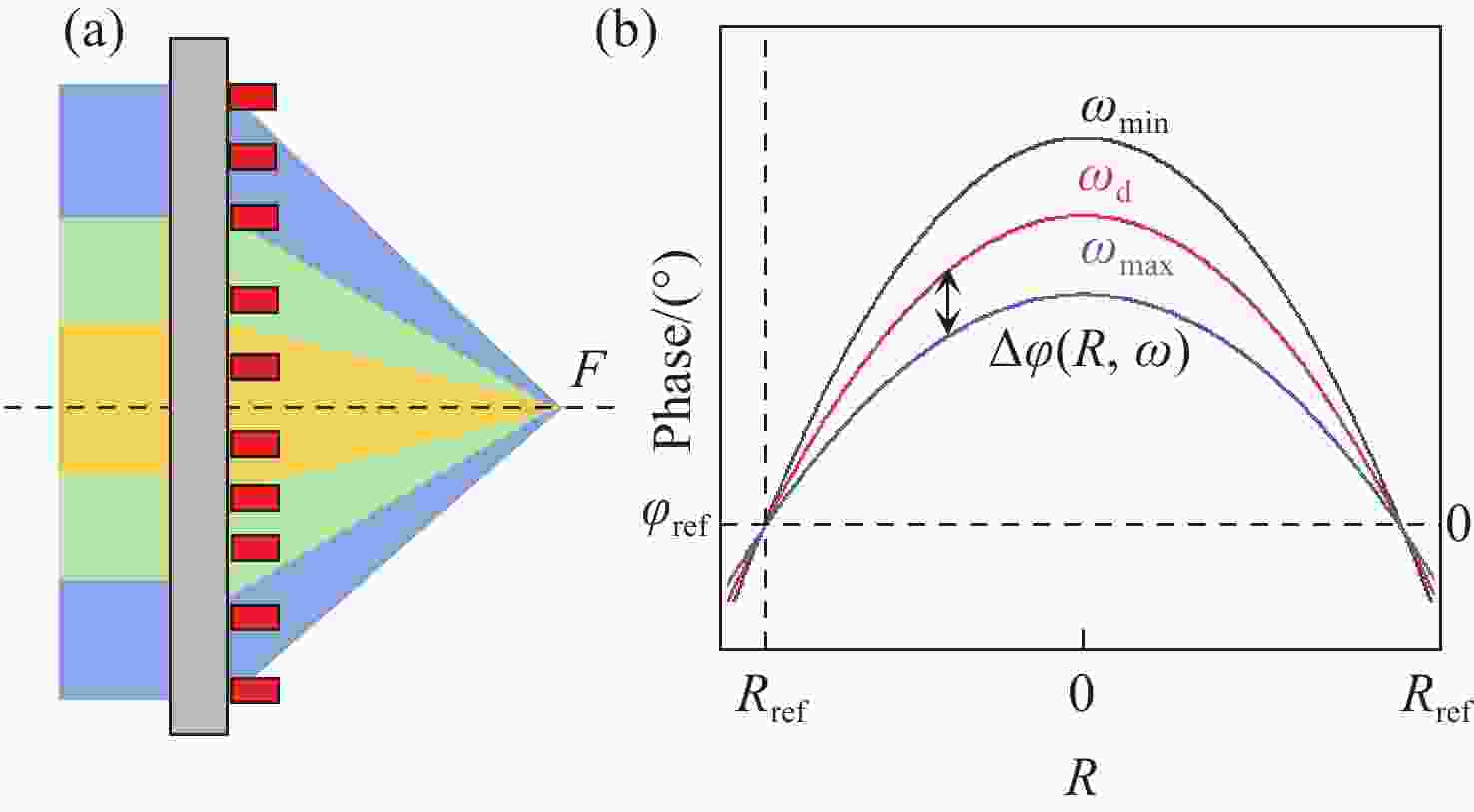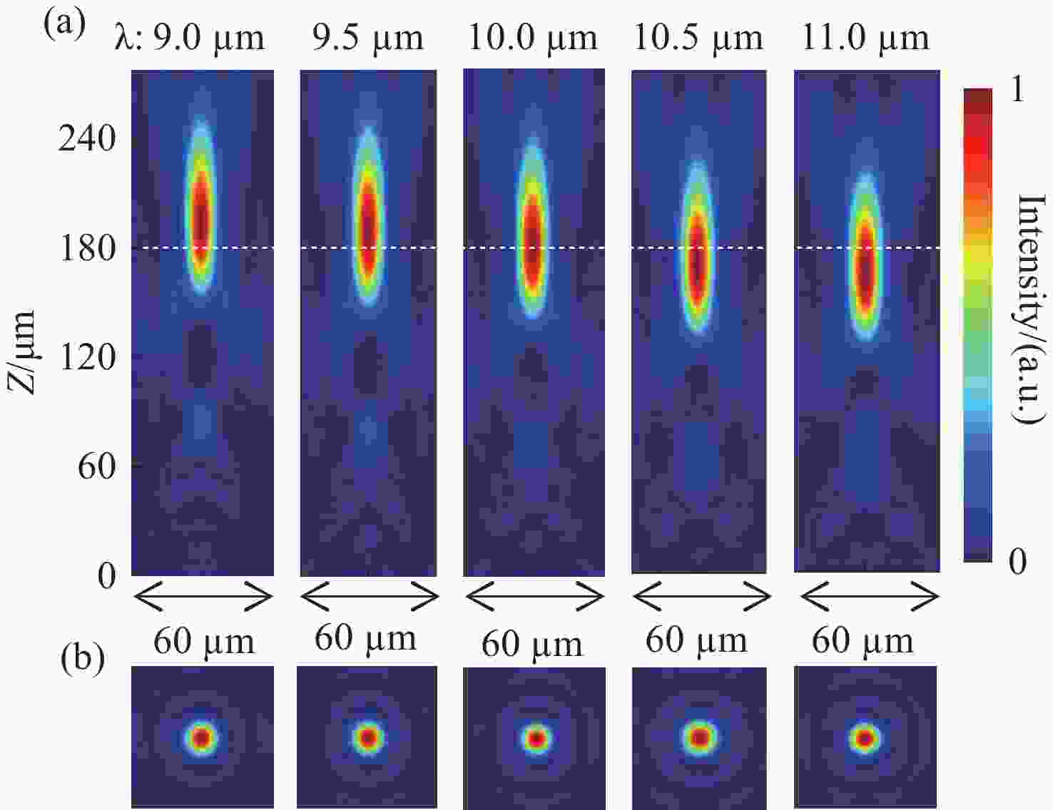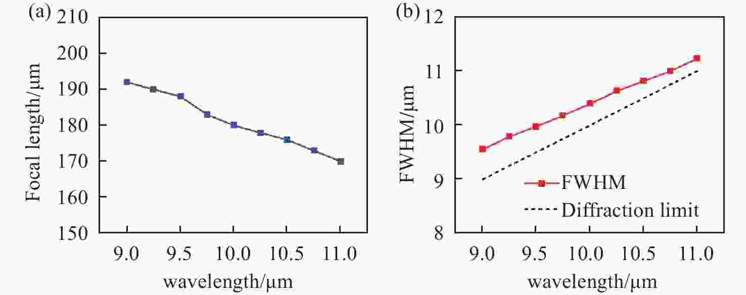 超透镜技术在小型化、集成化红外成像系统中有着广泛的应用。然而,由于单元结构的色散较高,导致超透镜经常出现色差,使得宽带消色差红外成像难以实现。该文章构建了基于硫系玻璃的6种不同单元结构,并对其相位色散参数进行分析,建立数据库。在此基础上,采用色差补偿和参数化伴随拓扑优化的方法,在远红外波段将这6种单元结构排列组合,设计出数值孔径为0.5的宽带消色差超透镜。仿真结果表明,该超透镜在9~11µm的工作波长范围内实现了近衍射极限聚焦,具有良好的消色差性能,全波长具有为54%~58%的平坦的聚焦效率。