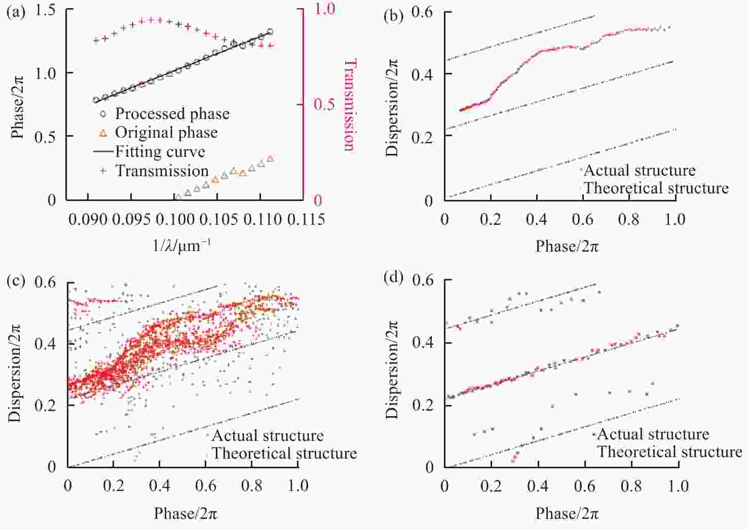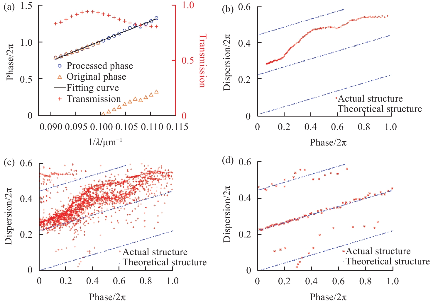 Figure 3. (a) Phase simulation results of unit structure. (b) Distributions of the phase-dispersion parameters for the solid square column structure, where red cross and blue point represent the phase-dispersion parameters of an actual square column structure and the theoretical structure, respectively. (c) Database of the phase-dispersion parameters for all unit structures. (d) Distributions of the phase-dispersion parameters of the initial structure closest to theoretical structures for each position