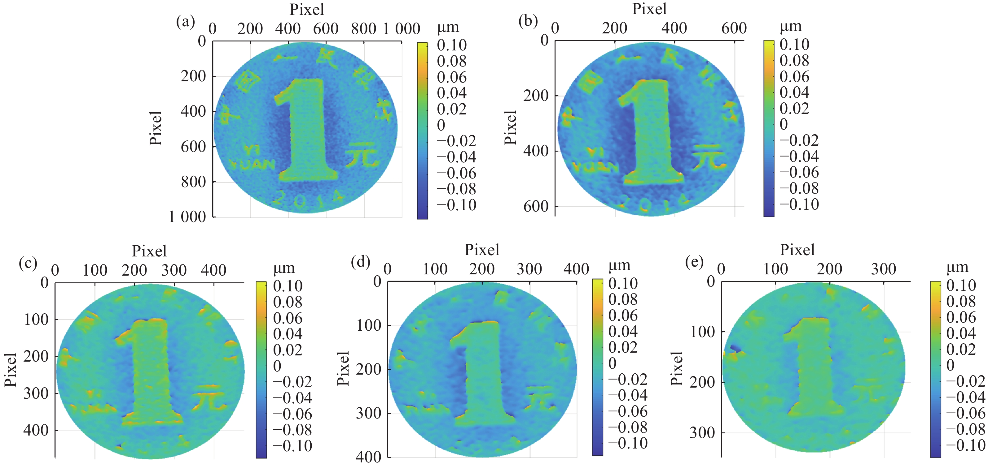 Figure 5.  3D topographies of coin at different distances. (a)-(e) 3D topographies of coin located 1m to 5 m away from the first mirror M, with a spacing of 1 m.
