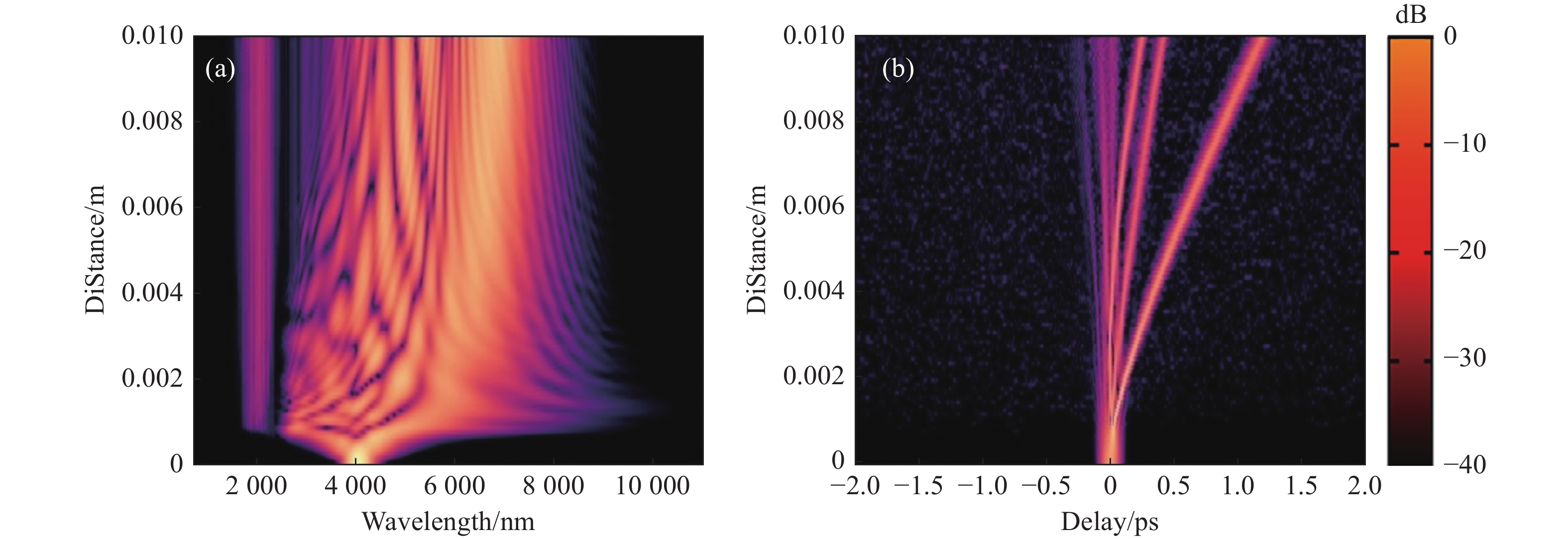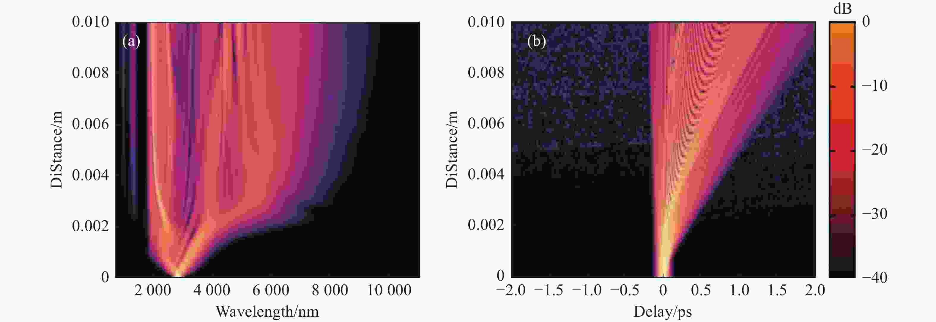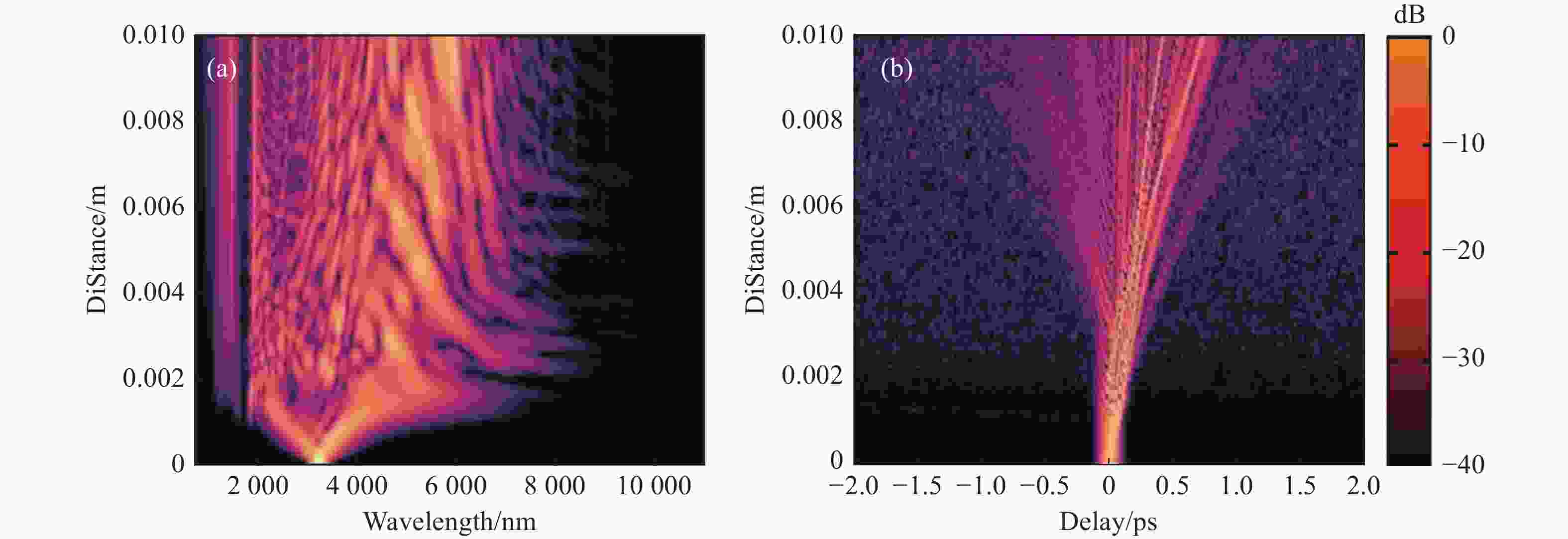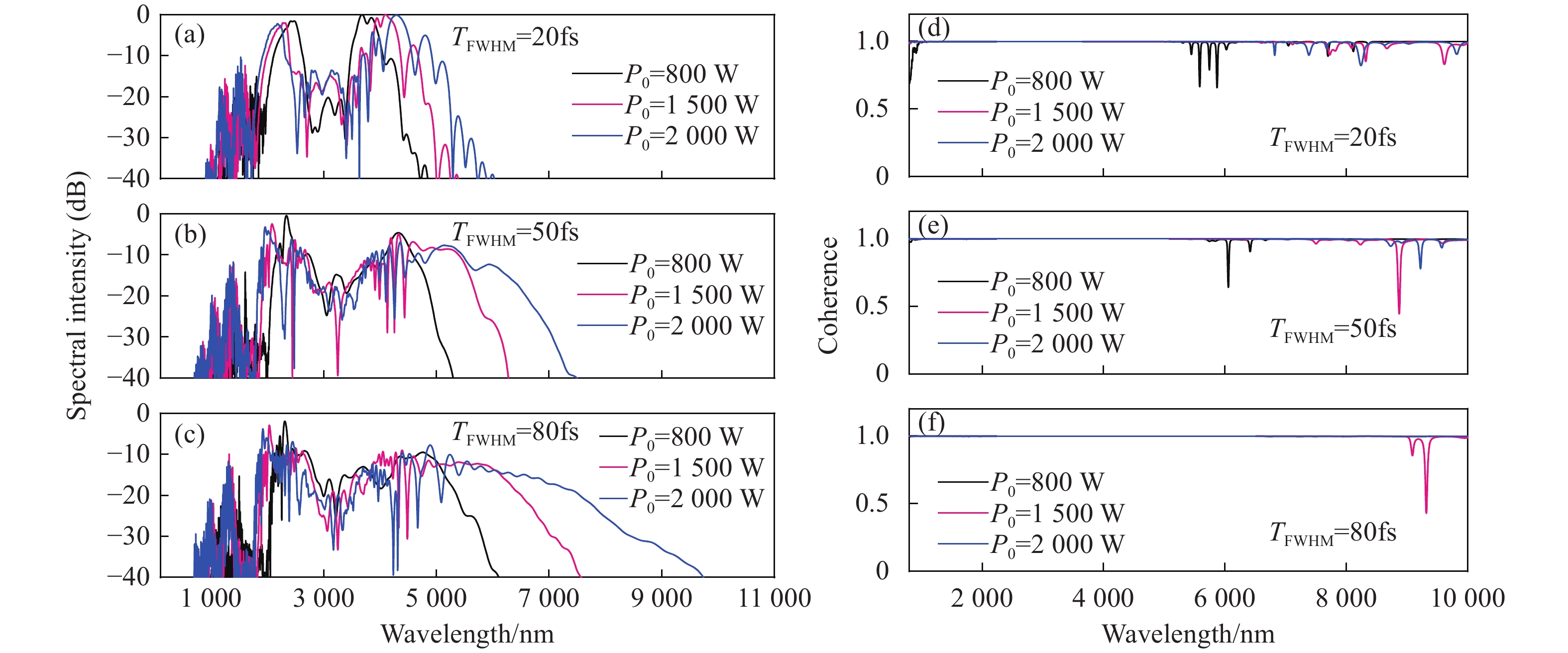 λpump=3.3 μm TFWHM=20 fs TFWHM=50 fs TFWHM=80 fs P0=800 W N=6.50 N=16.20 N=25.86 Lfiss=1.65 mm Lfiss=4.12 mm Lfiss=6.60 mm LMI=4.08 mm LMI=4.08 mm LMI=4.08 mm P0= 1500 WN=8.85 N=22.00 N=35.40 Lfiss=1.20 mm Lfiss=3.00 mm Lfiss=4.80 mm LMI=2.18 mm LMI=2.18 mm LMI=2.18 mm P0= 2000 WN=10.20 N=25.56 N=40.90 Lfiss=1.04 mm Lfiss=2.61 mm Lfiss=4.2 mm LMI=1.60 mm LMI=1.60 mm LMI=1.60 mm 表 2 Soliton order and characteristic lengths for different pulses at a pump wavelength of 4.0 μm.