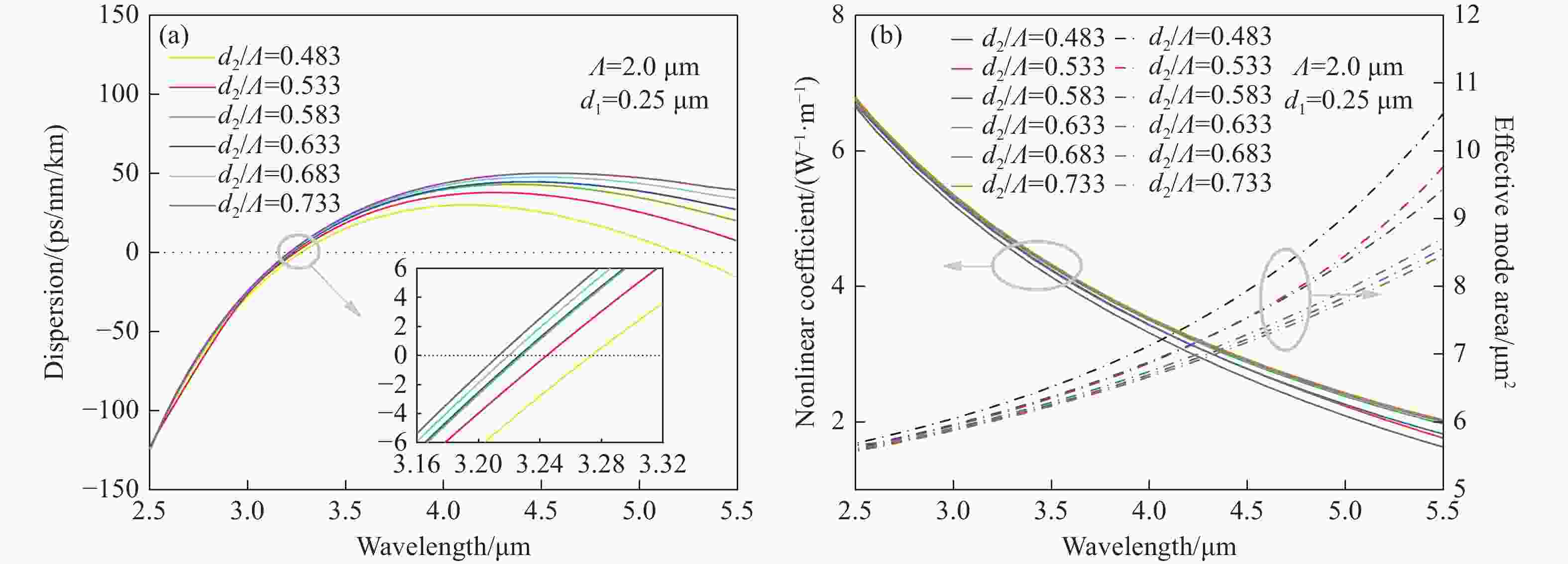 d 1/Λ 为0.125、d 2/Λ 为0.583并且零色散波长为3.228 μm时,通过在3.3μm处以峰值功率800 W、半高全宽20 fs的高斯脉冲泵浦10 mm光纤,可获得谱宽为4.852 μm的超连续谱。在反常色散区泵浦脉冲波长为4.0 μm、峰值功率为2000 W、半高全宽为80 fs时,调制不稳定性效应被明显抑制,可获得从1.1 μm扩展到8.99 μm的宽带高相干性超连续谱。在正常色散区2.8 μm处泵浦该光纤,可使部分脉冲能量转移到反常色散区,可在10 mm光纤输出端得到了从0.8 μm扩展到9.8 μm的宽带高相干性超连续谱。本文在Al0.24Ga0.76As光子晶体光纤中引入了椭圆气孔,为调整超连续谱的性能增加了灵活度,实现了用最短的光纤获得了最宽的超连续谱。-