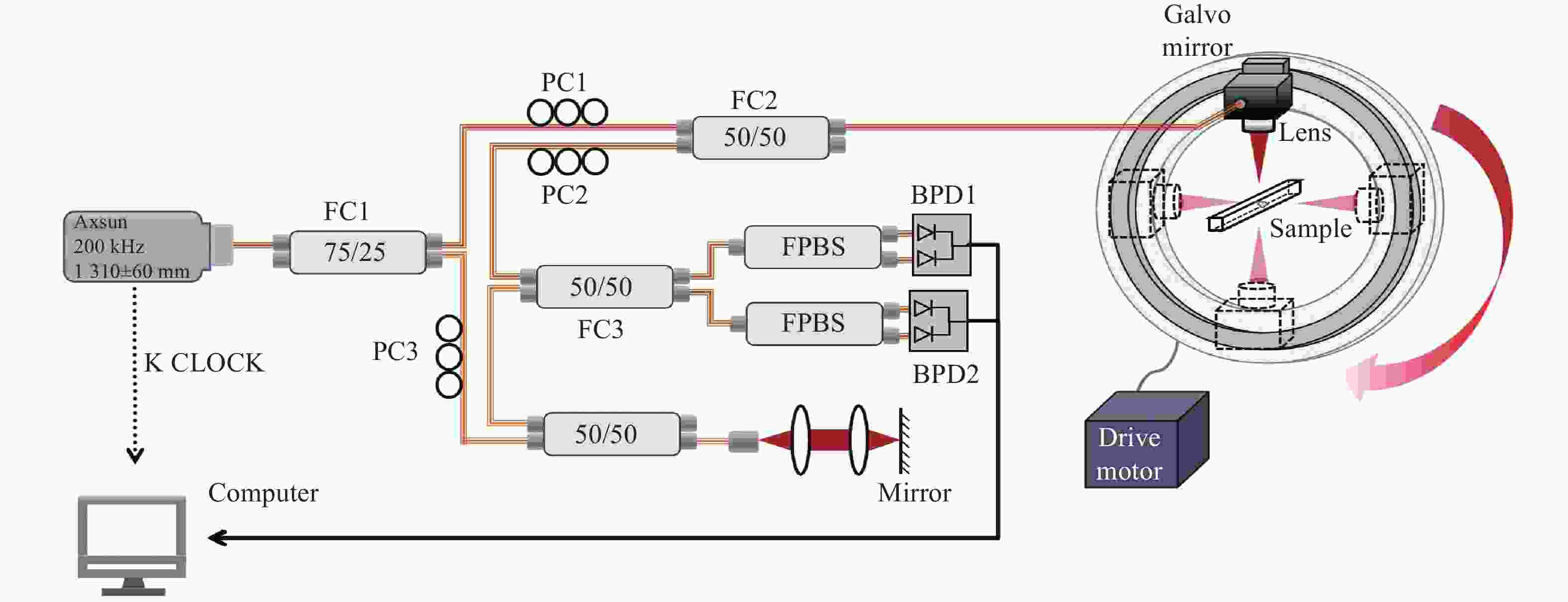 • Figure 1.  Schematic of the multi-view polarized optical coherence imaging system (PC: polarization controller, FPBS: fiber polarization beam splitter, BPD: photoelectric balance detection, K CLOCK: wavenumber clock signal, FC: fiber coupler)