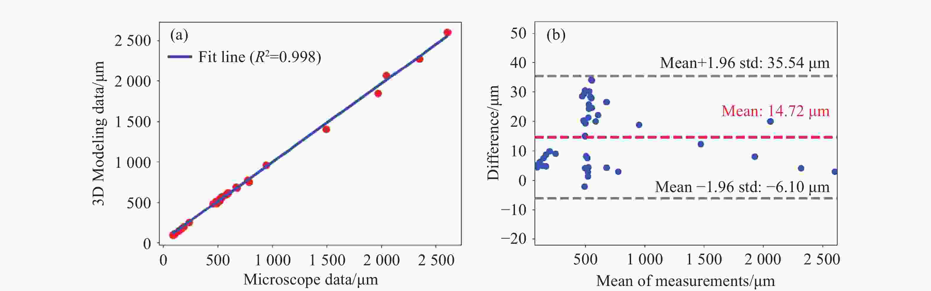 Figure 5.  Comparative analysis of the 3D modeling and microscope measurement results. (a) Linear fitting chart of two groups of data; (b) Bland-Altman analysis chart of two groups of data