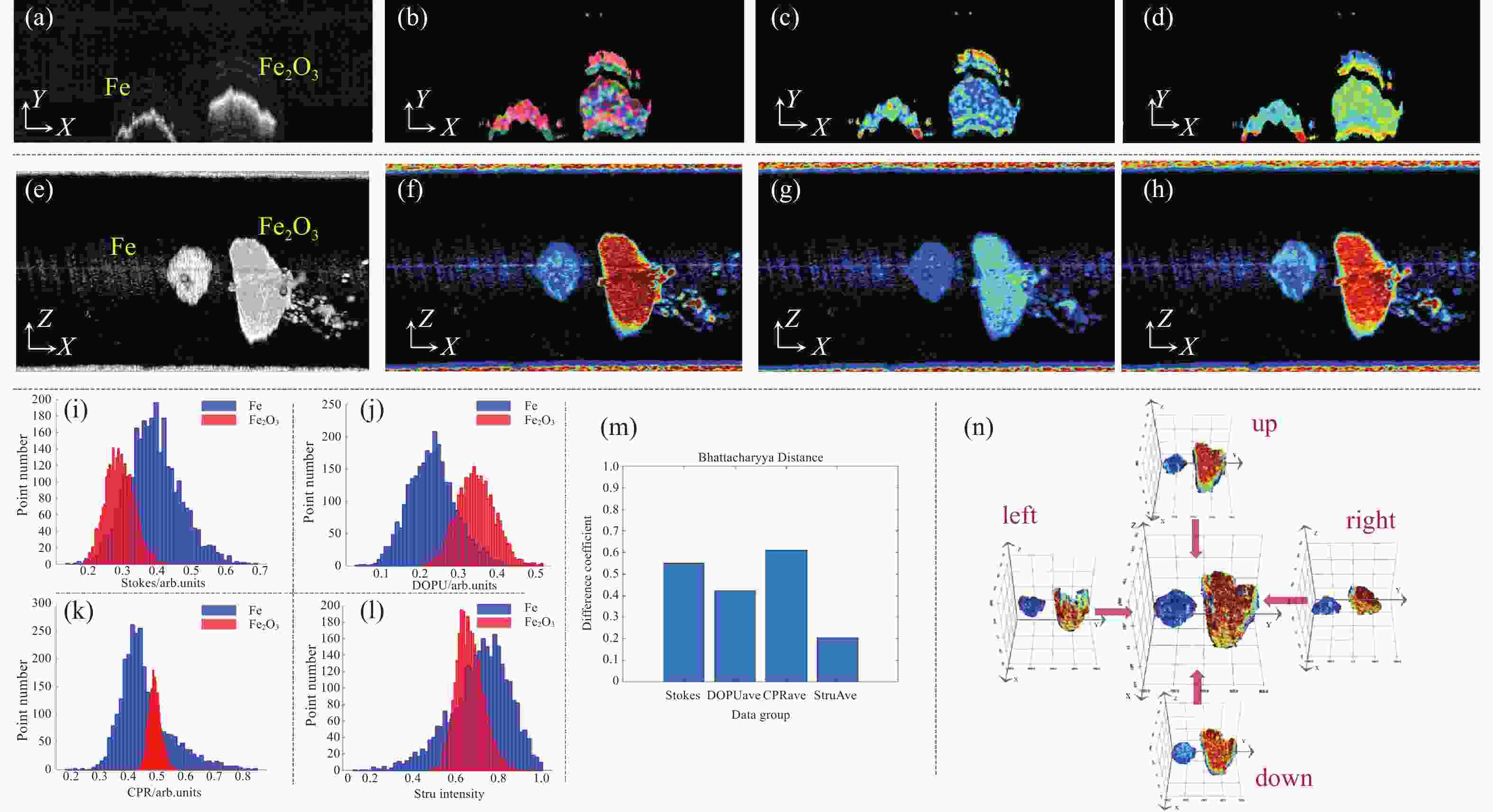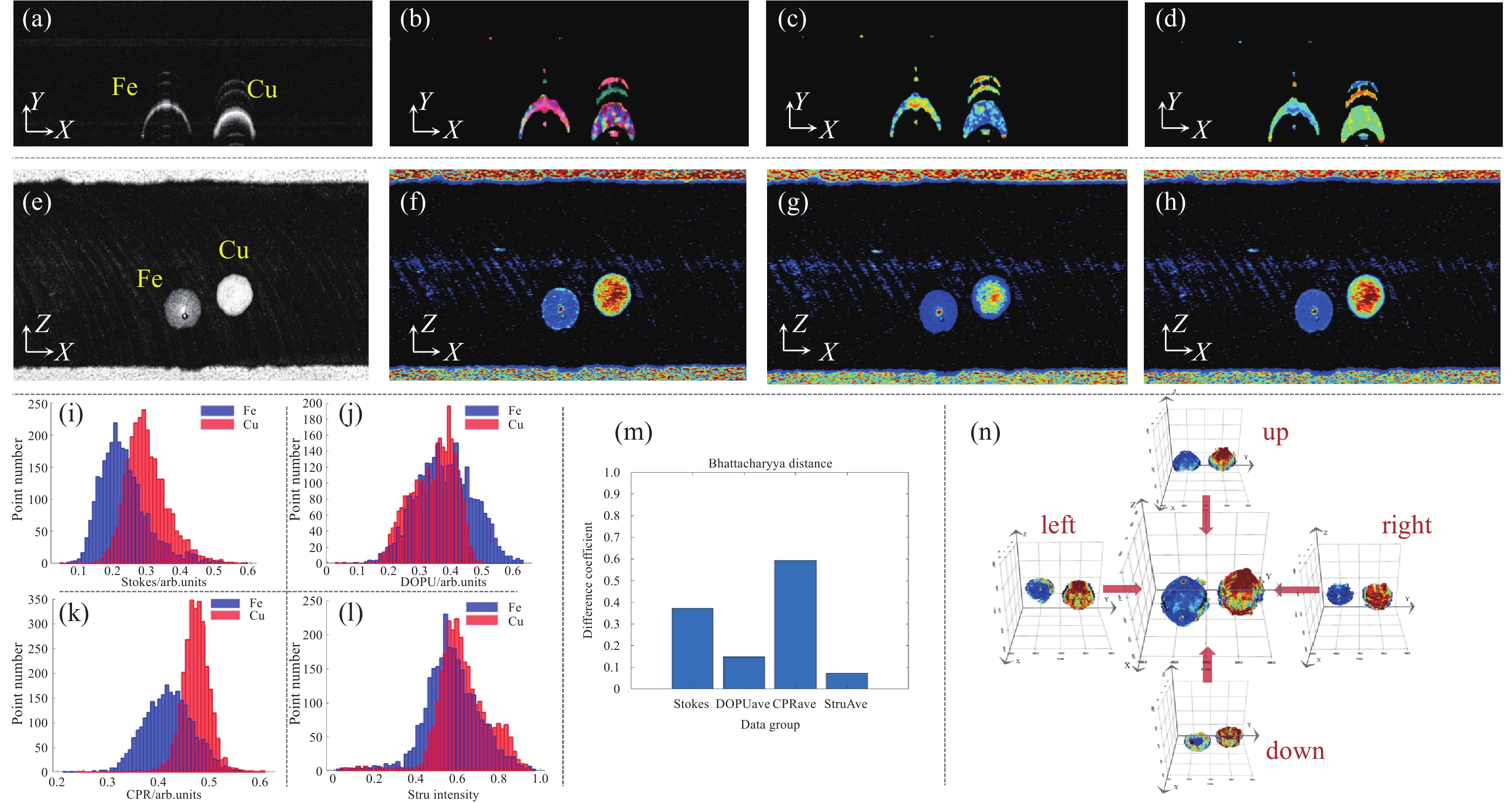 Figure 7.  Polarization analysis of iron and ferric oxide clusters. (a) Stru cross-sectional image; (b) Stokes cross-sectional image; (c) DOPU cross-sectional image; (d) CPR cross-sectional image; (e) Stru en-face image; (f) Stokes en-face image; (g) DOPU en-face image; (h) CPR en-face image; (i) Stokes signal strength histogram; (j) DOPU signal strength histogram; (k) CPR signal strength histogram; (l) Stru signal strength histogram; (m) Bhattacharyya Distance Histogram; (n) Polarimetric 3D Model