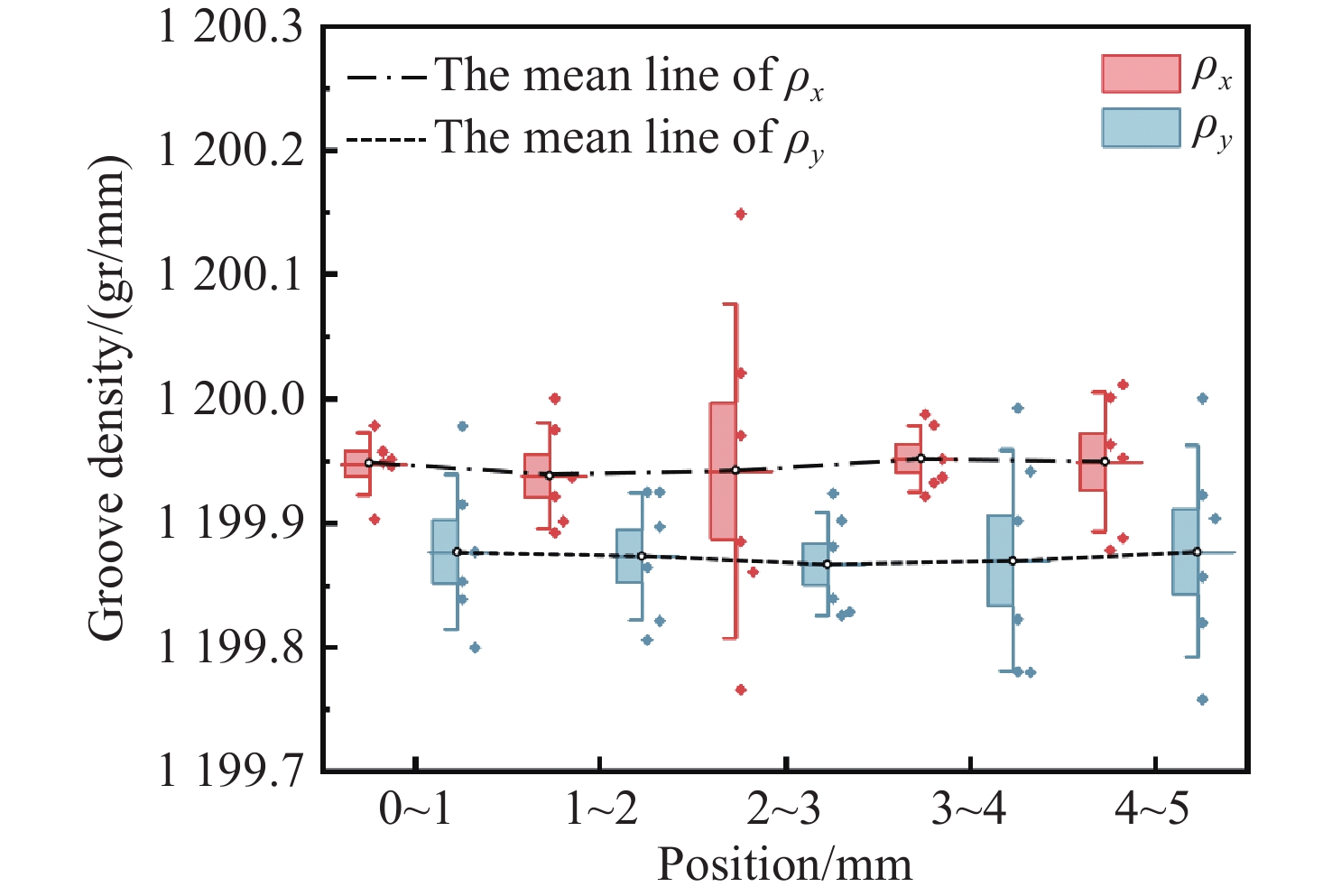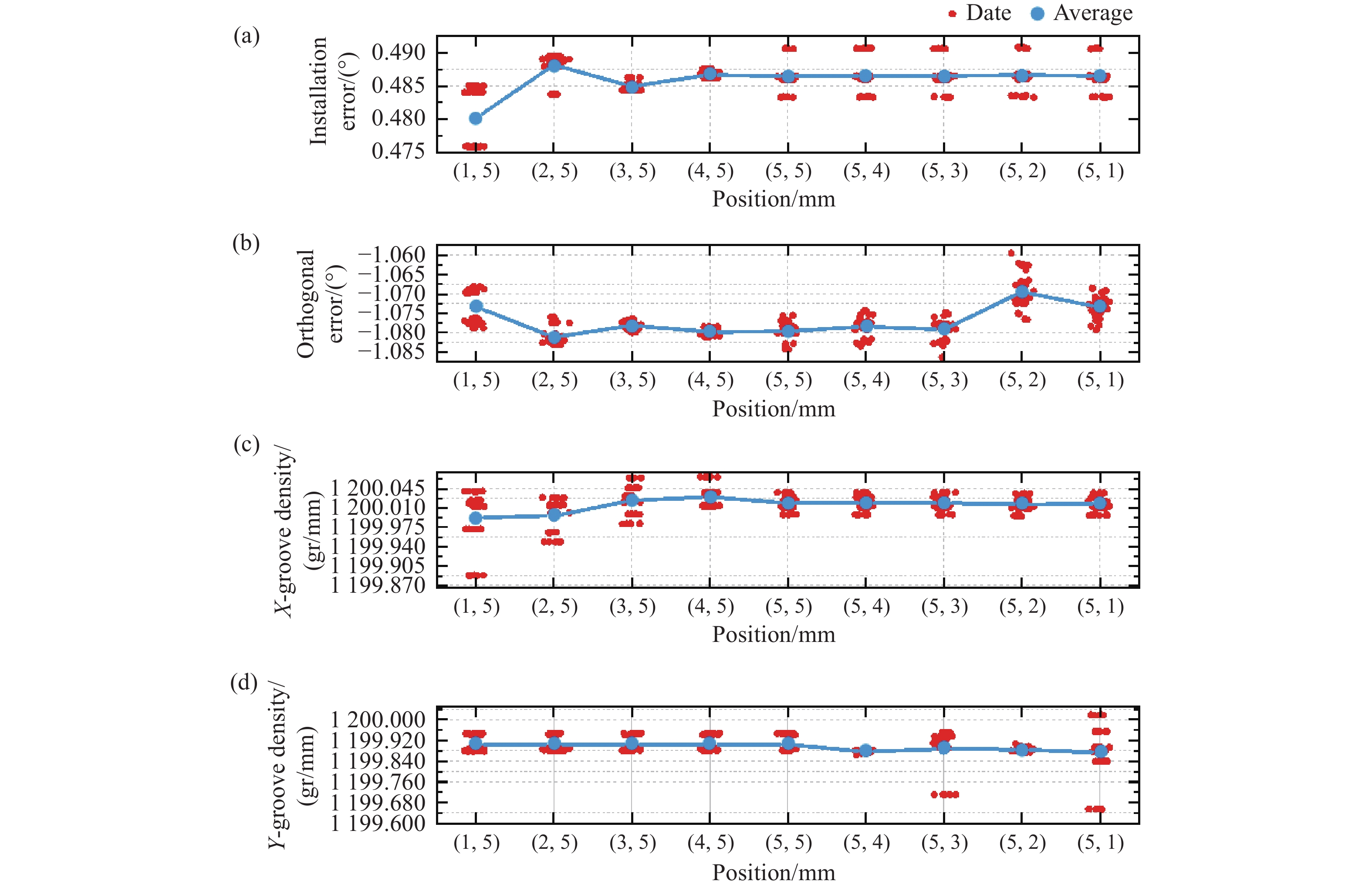 (xn,yn) θ(°) α(°) $ \rho $x(gr/mm) $ \rho $y(gr/mm) (1,5) 0.48016 − 1.07329 1199.99228 1199.90331 (2,5) 0.48820 − 1.08118 1199.99563 1199.90466 (3,5) 0.48496 − 1.07812 1200.02361 1199.90413 (4,5) 0.48669 − 1.07981 1200.02964 1199.90443 (5,5) 0.48652 − 1.07963 1200.01899 1199.90439 (5,4) 0.48654 − 1.07839 1200.01872 1199.87662 (5,3) 0.48653 − 1.07917 1200.01889 1199.88735 (5,2) 0.48668 − 1.06947 1200.01681 1199.88468 (5,1) 0.48653 − 1.07342 1200.01767 1199.87282 Average value 0.48587 − 1.07694 1200.01469 1199.89360 Standard deviation 0.002158 0.003702 0.01171085 0.01322980 Table 2. The results of the measurement of the 2D grating calibration area