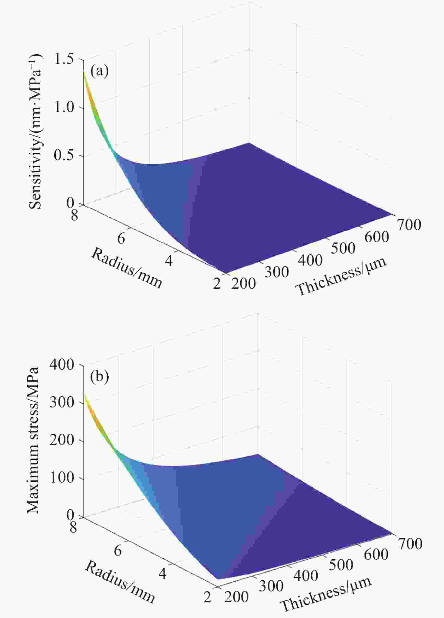Parameters Symbol Value Diaphragm radius/mm r 4 Diaphragm thickness/mm h 0.5 Sensor pressure range/MPa P 0~10 Sensitivity/(μm·MPa−1) S 0.322 Diaphragm yield stress/MPa σ 170 -