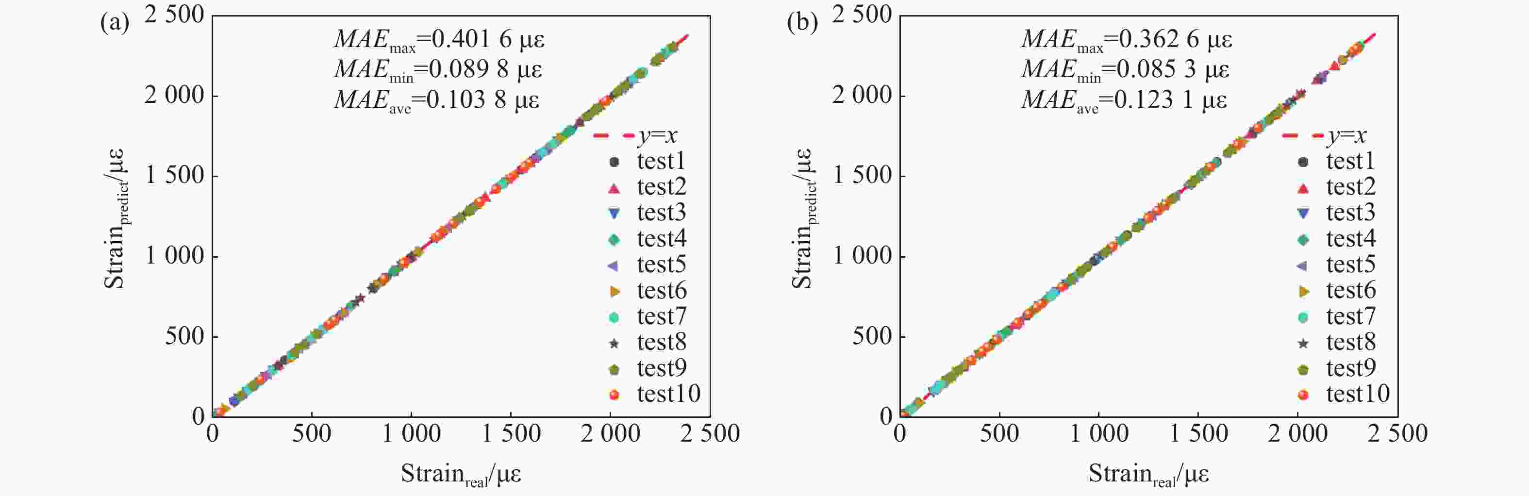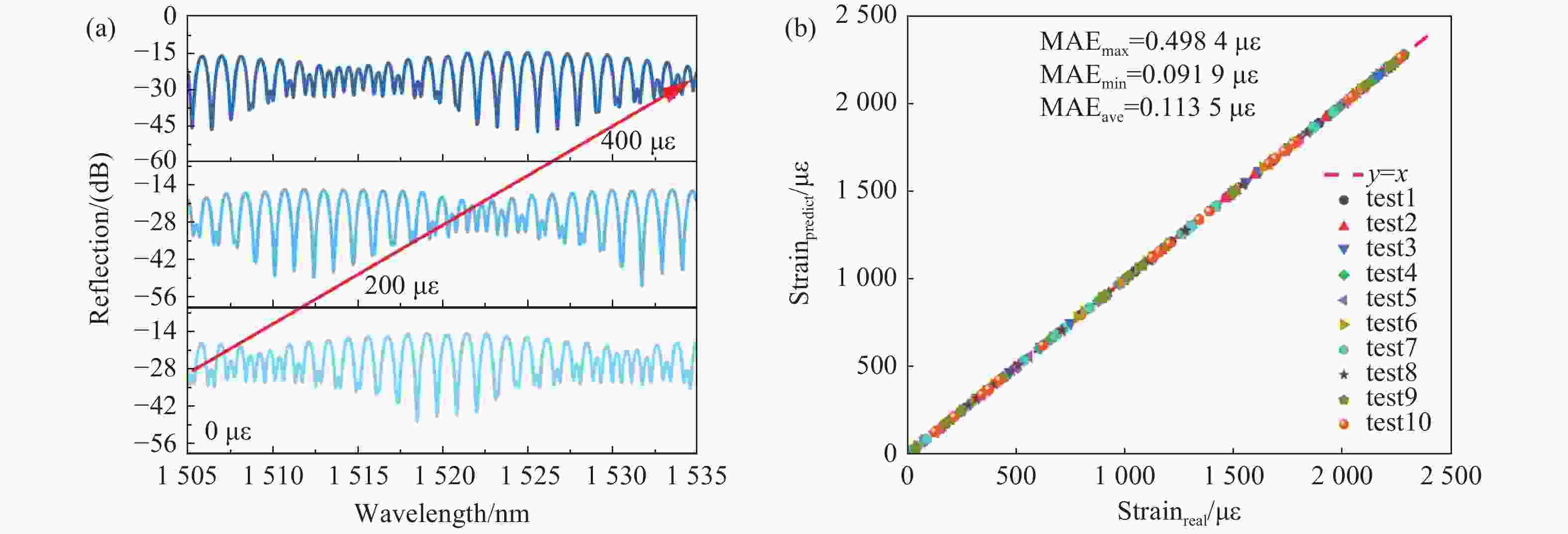 0.1038 $ \mu \varepsilon $ 的低平均绝对误差,并且消除了光谱范围对测量范围的限制。此外,与光谱跟踪技术相比,由于其可以使用低分辨率光谱进行解调,该改进互相关算法还具有提高测量速度的能力,因此该算法进一步提高了基于游标效应的光纤应变传感器解调性能。Abstract:The improved cross-correlation algorithm for the strain demodulation of Vernier-effect-based optical fiber sensor (VE-OFS) is proposed in this article. The algorithm identifies the most similar spectrum to the measured one from the database of the collected spectra by employing the cross-correlation operation, subsequently deriving the predicted value via weighted calculation. As the algorithm uses the complete information in the measured raw spectrum, more accurate results and larger measurement range can be obtained. Additionally, the improved cross-correlation algorithm also has the potential to improve the measurement speed compared to current standards due to the possibility for the collection using low sampling rate. This work presents an important algorithm towards a simpler, faster way to improve the demodulation performance of VE-OFS.